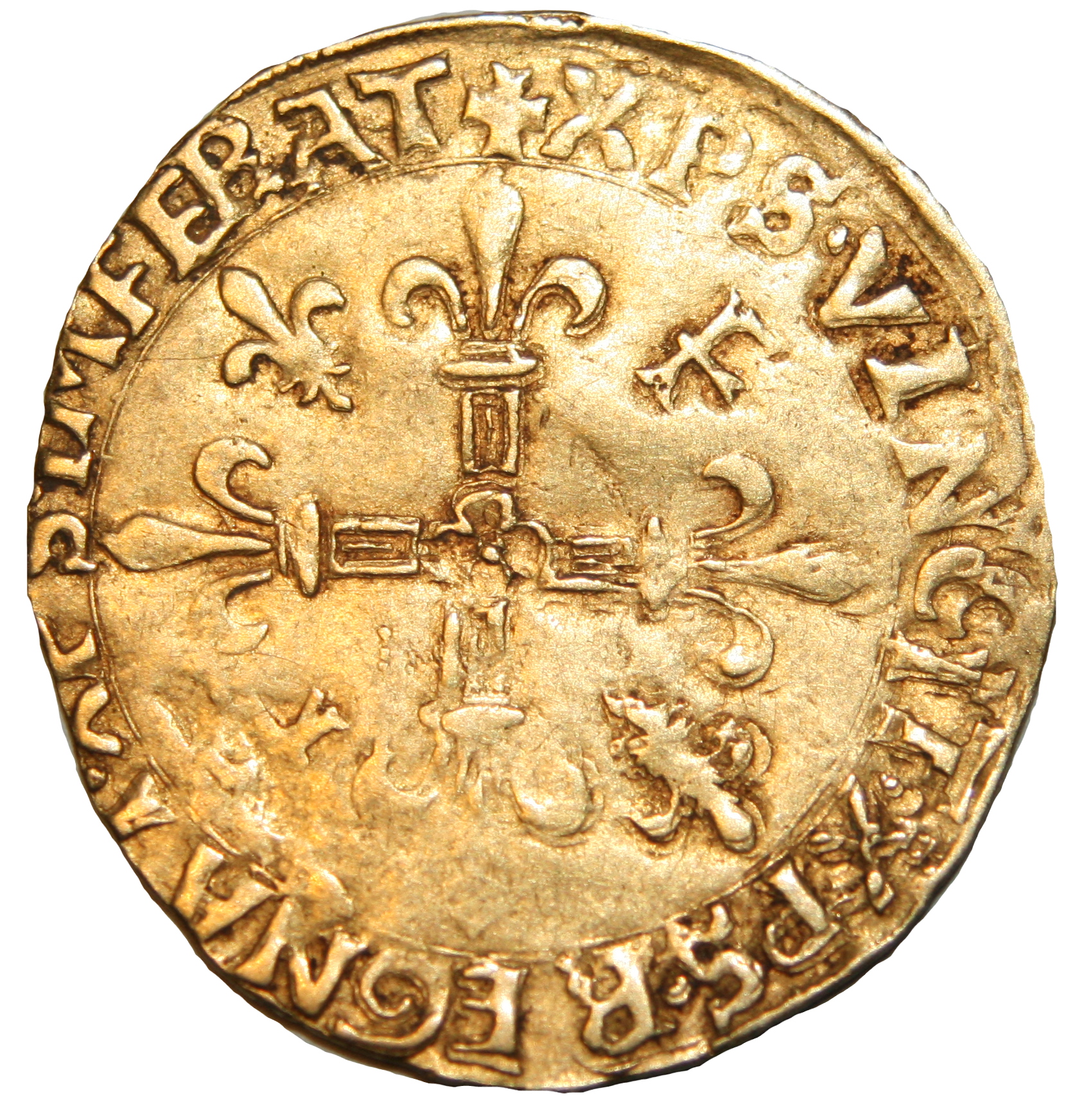 à propos de ce type monétaire : Les écu d'or au soleil à ce type (5éme) furent frappés suite à l'ordonnace du 21 juillet 1519. Jusqu'au 31 janvier 1540, et l'identification des ateliers par des lettres, les ateliers furent identifiés par points, par des lettres dans la légende ou par des symboles. Villefranche de Rouergue était identifié par un V gothique. La monnaie présente quelques faiblesses de frappe et une légende prészntant deux erreurs au droit : FRACORU.EX |