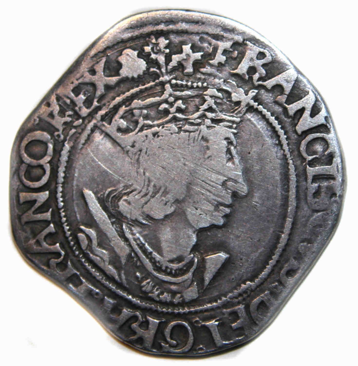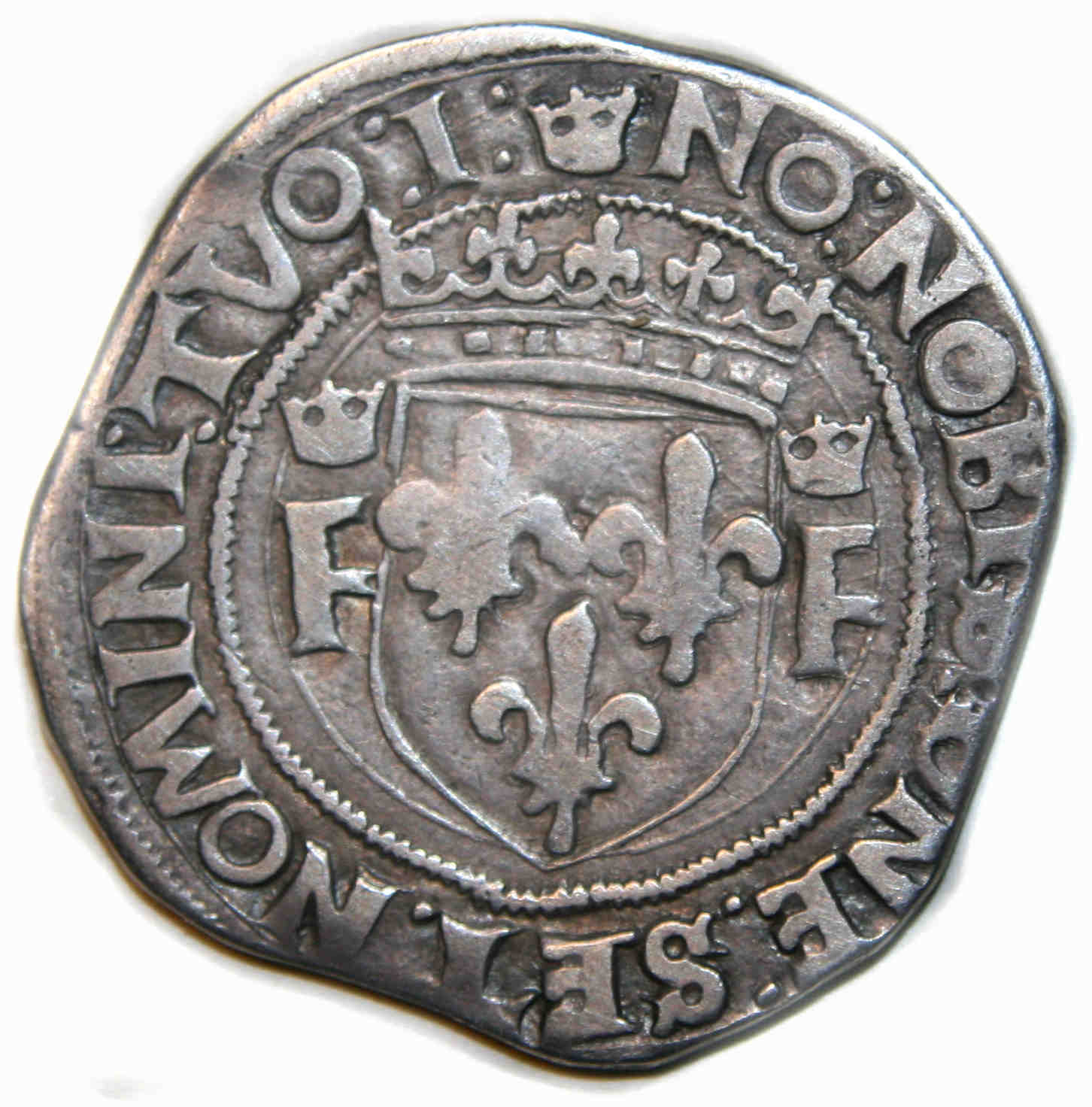 à propos de ce type monétaire : Les testons à ce type (13éme pour Duplessy et 10 éme pour Lafaurie) furent frappés à Lyon, Troyes et Dijon. Le flan porte 3 coups de cisailles qui en réduisent le poids. La monnaies est belle malgré une effigie du roi portant des traces de griffures. Ce teston est postérieur au 10 septembre 1521. En effet, les lettres patentes ordonnant la 2éme émission , réduisent le titre de 938/1000 à 899/1000 et ordonnent le remplacement de la croisette initiale du revers par une couronnelle |