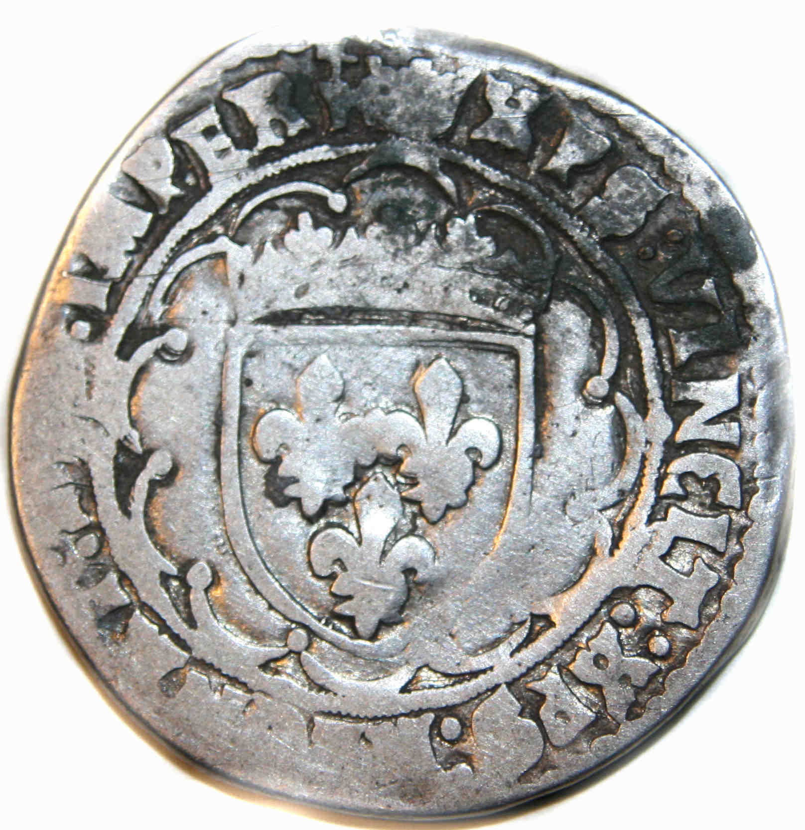 à propos de ce type monétaire : Les testons à ce type (4éme pour Duplessy et 6 éme pour Lafaurie) furent frappés à TOURS. Les lettres patentes du 10 septembre 1521 ayant supprimé la croisette du début de légende au revers par une couronnelle, on peut estimer que la monnaie a été frappée entre cette date et 1523 La monnaie a souffert d'une circulation probablement assez importante. A noter l'erreur de légende FRACOR. |