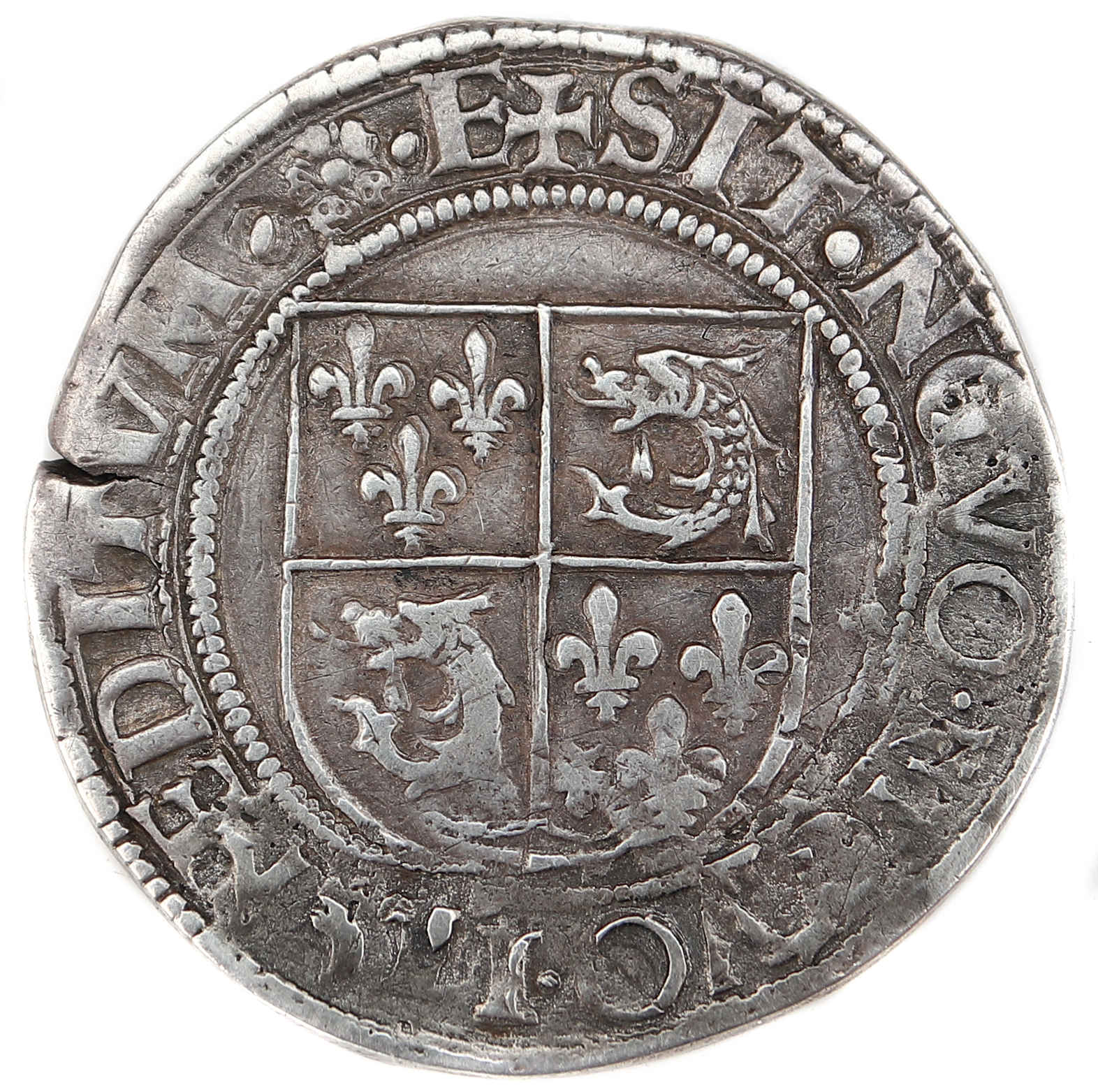 à propos de ce type monétaire : Les testons à ce type (4me du Dauphiné dans DUPLESSY) furent frappés à GRENOBLE. Il existe des variétés avec une croisette sur l'épaule gauche du roi et d'autres avec un dauphin surmontant l'écu au revers. Le flan est régulier mais un peu léger. La frappe est bien centrée. Le portrait du roi n'est pas à l'avantage de ce dernier. La monnaie est trés intéressante sur le plan numismatique car au revers on voit que la légende en surcharge partiellement une autre qui doit être NO NOBIS DNI SED NOI TVO DA GLO, légende de revers de certains ateliers comme LYON, DIJON, TROYES, CREMIEU.... A noter aussi au droit au dessus du buste du roi, une autre confusion de légende. Axe des coins : 7h. |