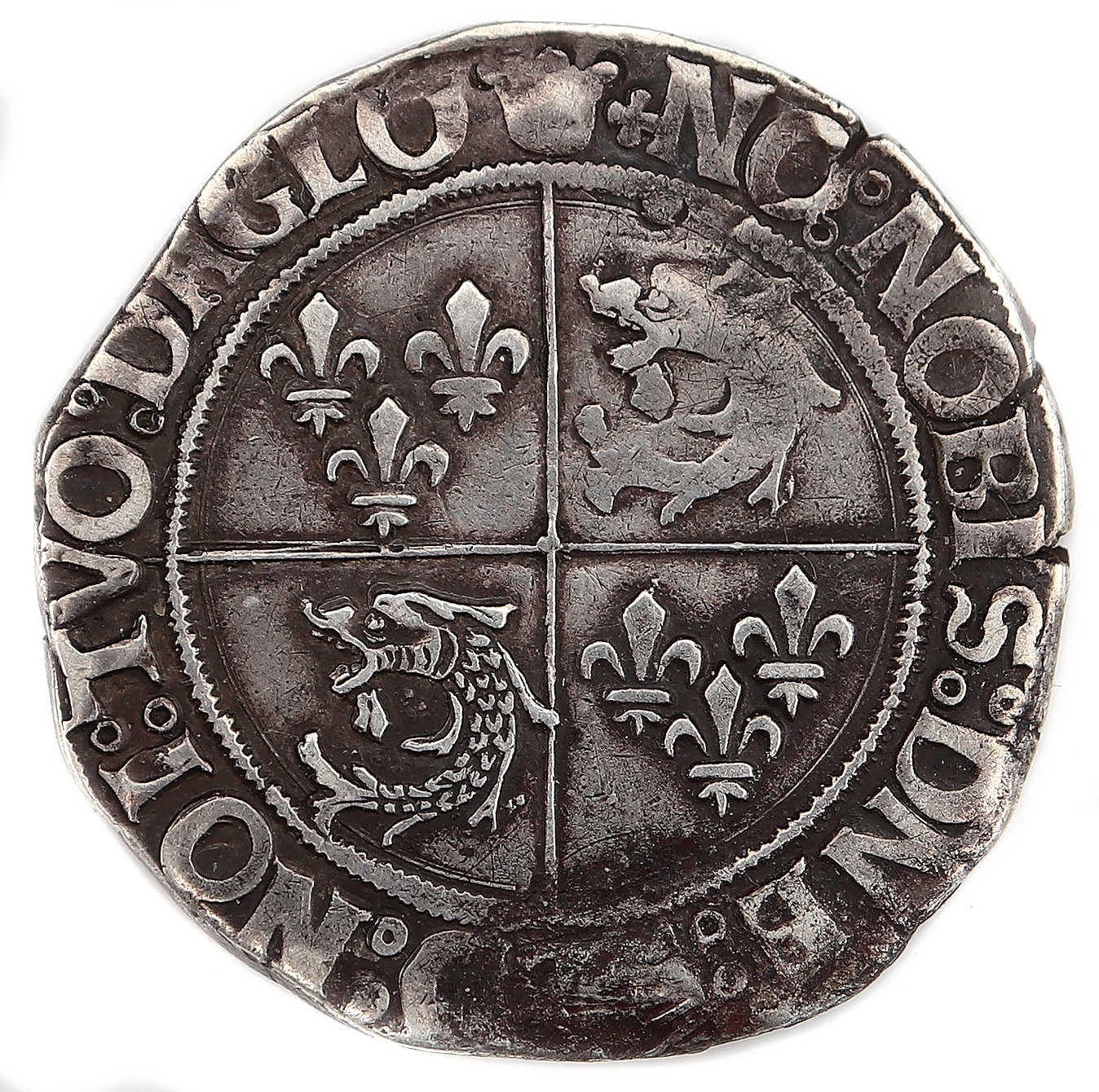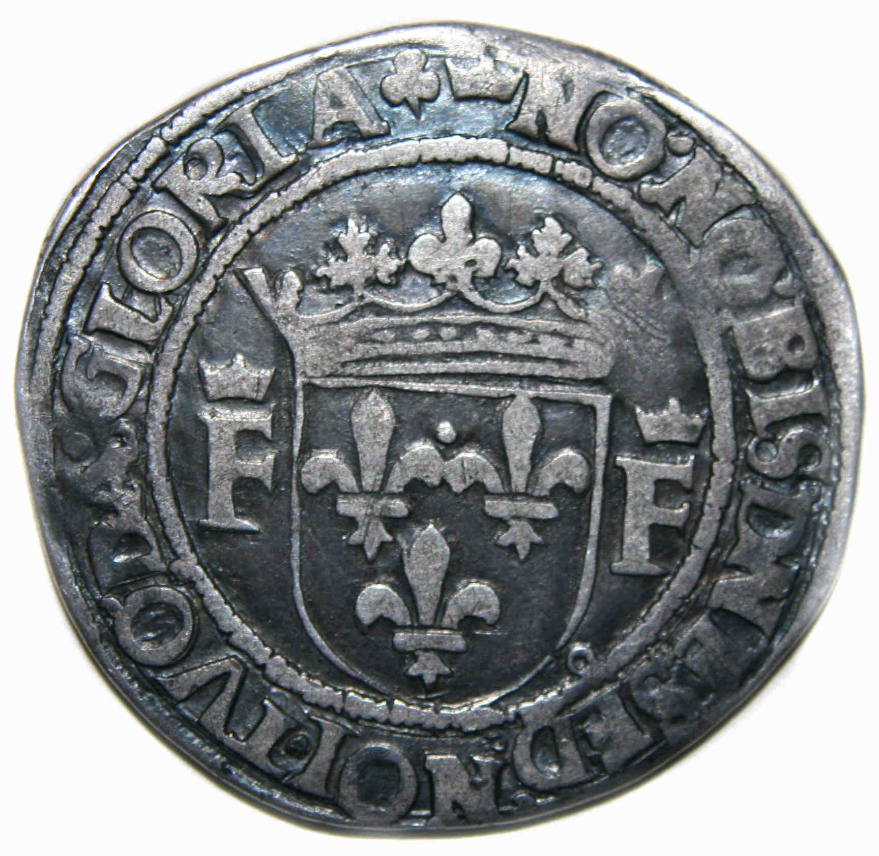 à propos de ce type monétaire : Avec une croisette initiale au droit et une couronnelle au revers, la monnaie serait de la deuxième émission selon LAFAURIE, soit aprés le 10 septembre 1521. La première émission présenterait une croisette initiale tant au droit qu'au revers. Toutefois DUPLESSY conteste l'existence de cette première émission telle que décrite par LAFAURIE. Le différent de Nicolas RICART (une croix constituée de 4 triangles) permet de dater plus précisément la monnaie : les premières délivrances effectuée par ce dernier ayant eu lieu fin janvier 1526 L'absence de couronnelle coupant le trait de l'écartelé au revers indique elle que la monnaie a été frappée avant juillet 1528. Il est à noter que Nicolas RICART fut condamné en 1533 "a estre boullu en la place commune acoustumée à faire exécucions en la ville de Crémieu" Pour la période 1517-1538, la frappe d'équivalents testons (testons et demi) est estimée à 163 404 pièces. Monnaie trés correcte pour ce type et cet atelier avec une jolie frappe bien centrée. Axe des coins : 3 h. |