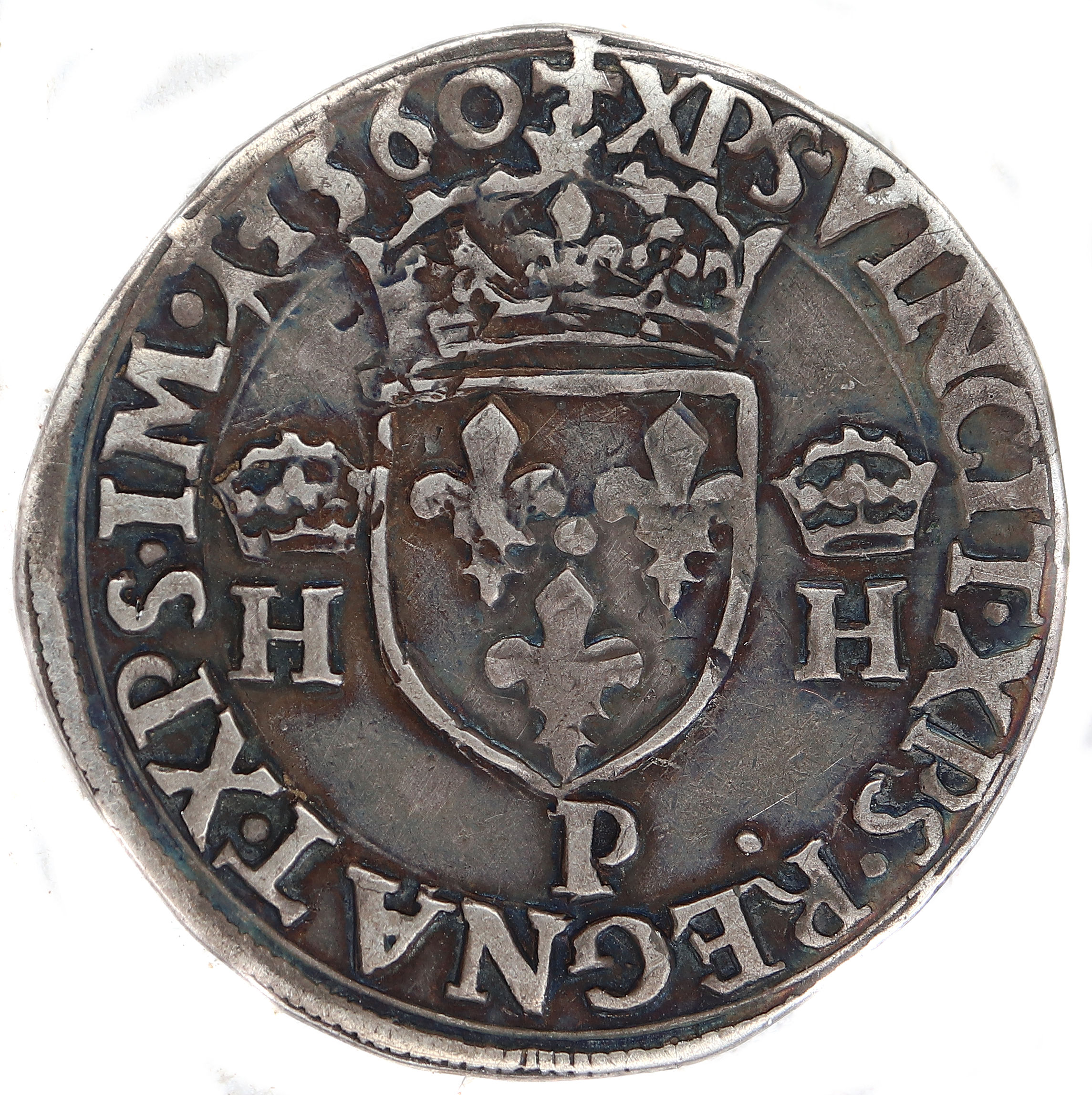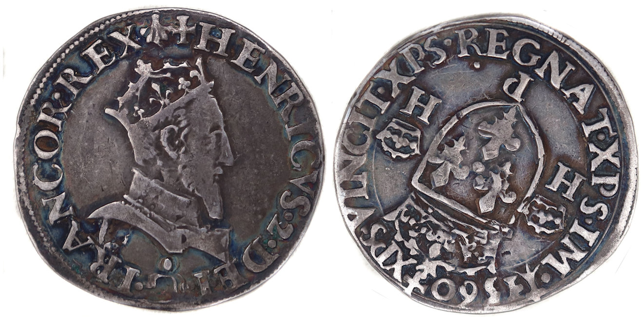 Lettre d'atelier : P Point secret : 13 éme (au revers) et coquille St Jacques (fin de légente au droit) Millésime : 1560 Chiffre de frappe connu : NC Indice de rareté : R4 |