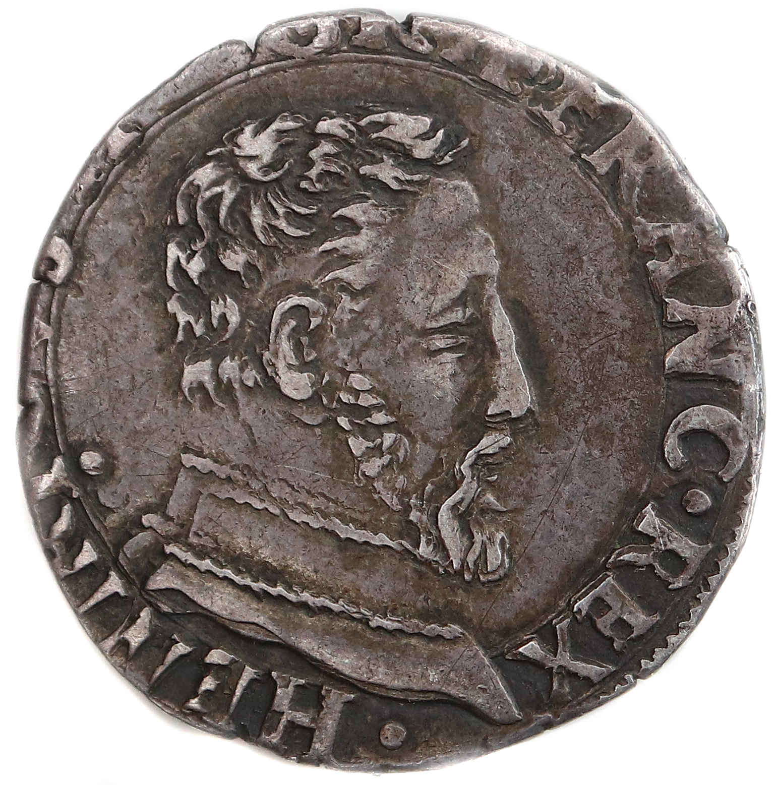 HENRICVS II..D.GRA.FRANC.REX HENRI , par la grâce de Dieu, roi des Francs Buste du roi à droite, tête nue avec un col |