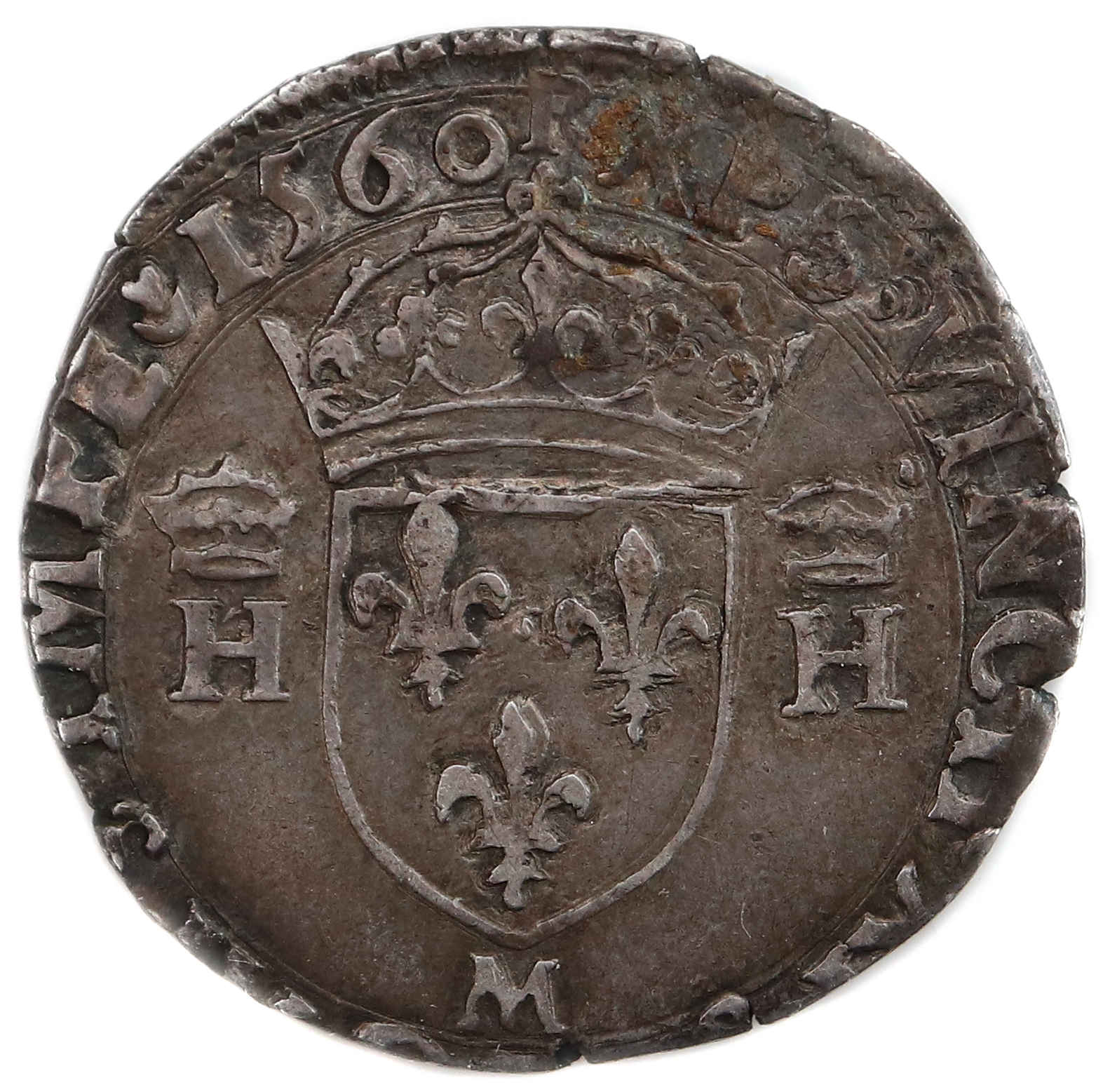Lettre d'atelier : M Point secret : Oui (5éme au droit et au revers) Millésime : 1560 Chiffre de frappe connu : 260 377 ex (avec testons) Indice de rareté : R2 |