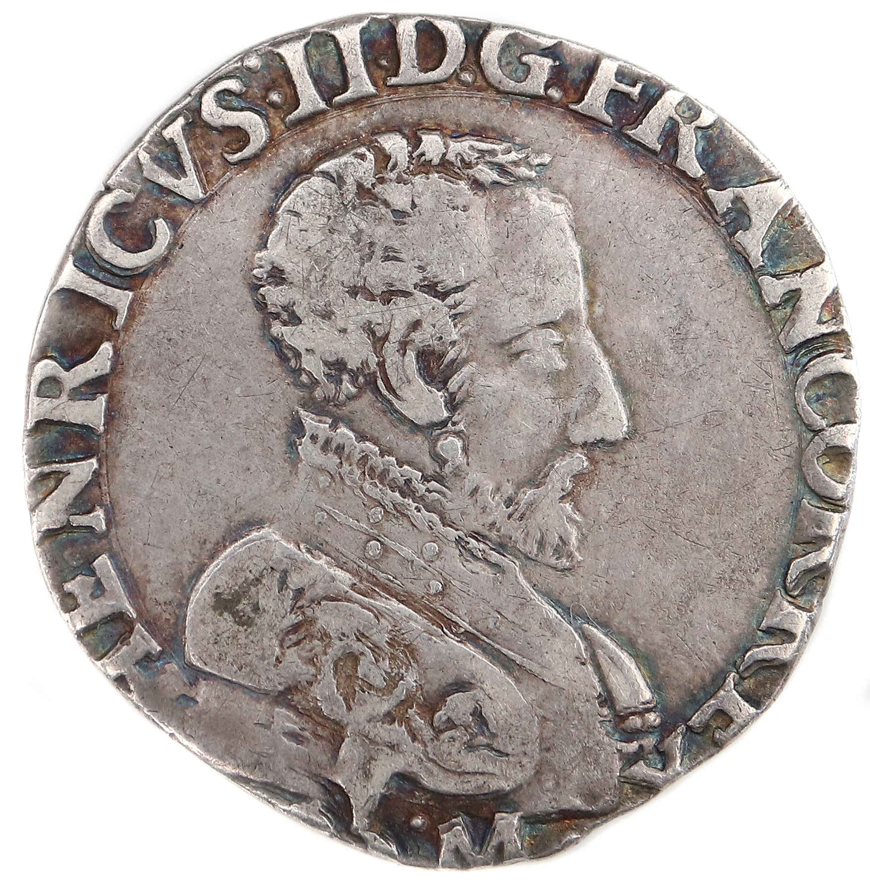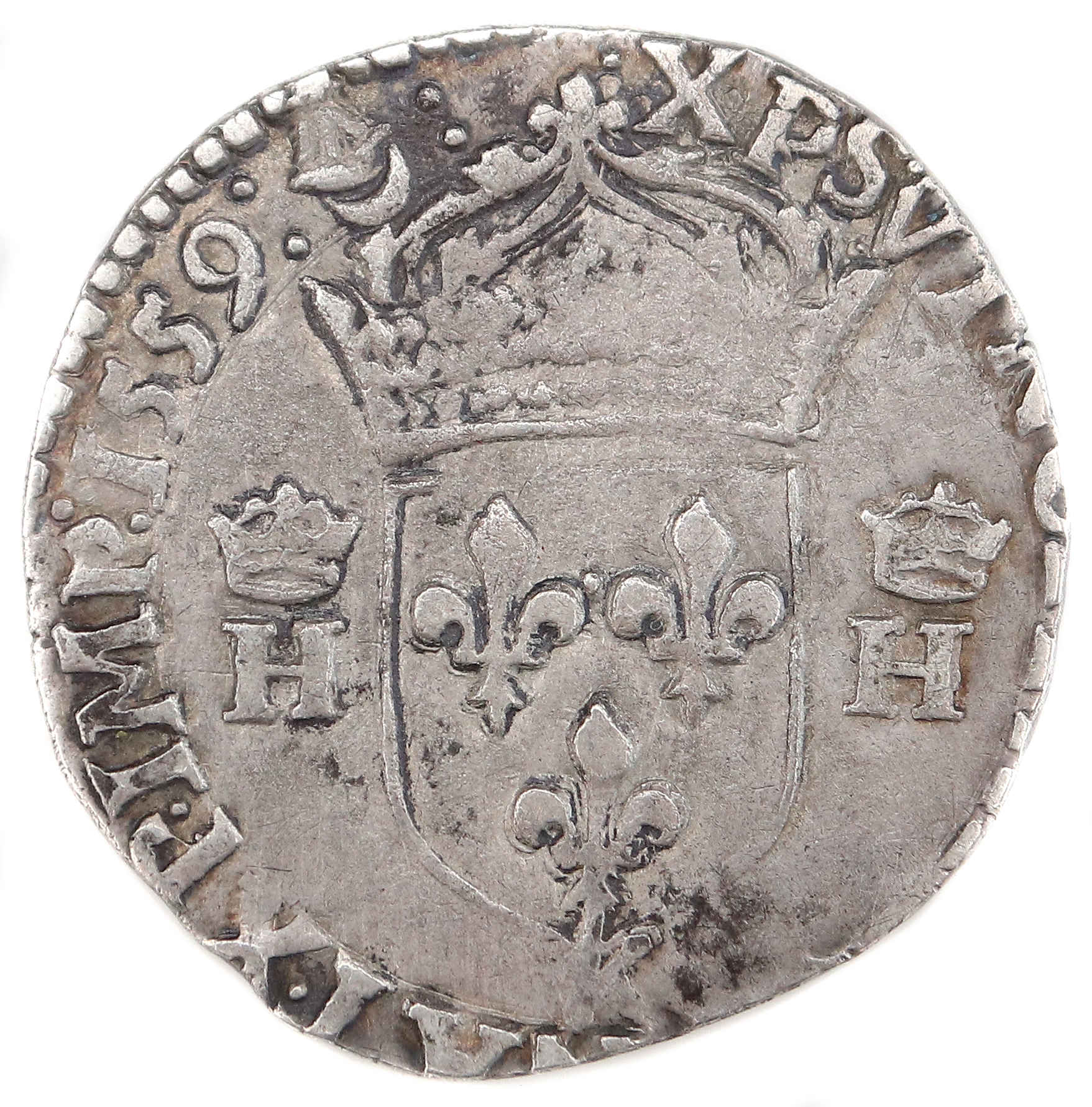HENRICVS.II.D.G.FRANCOR.REX M HENRI, par la grâce de Dieu, roi des Francs Buste du roi à droite avec cuirasse damasquinée |