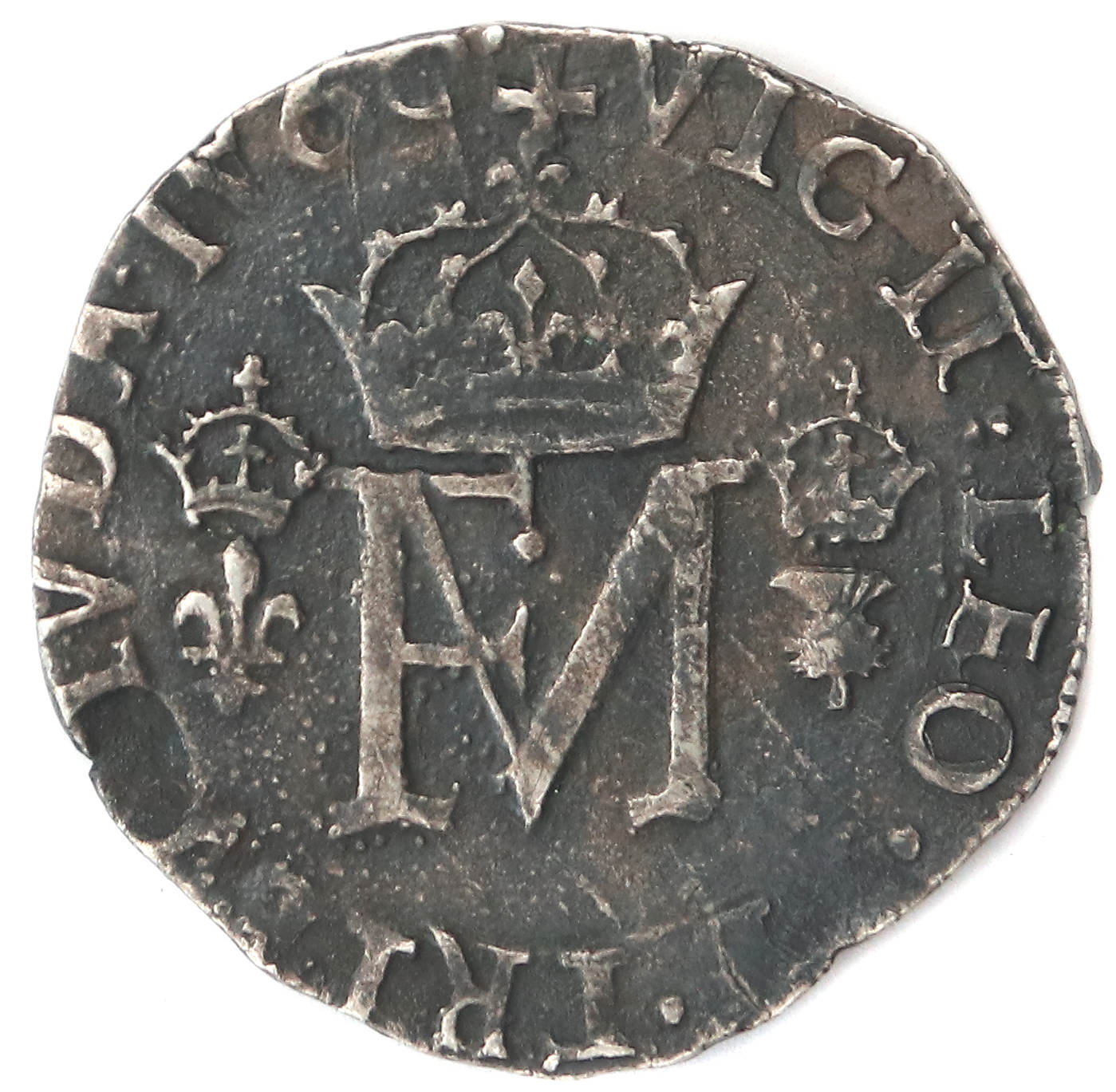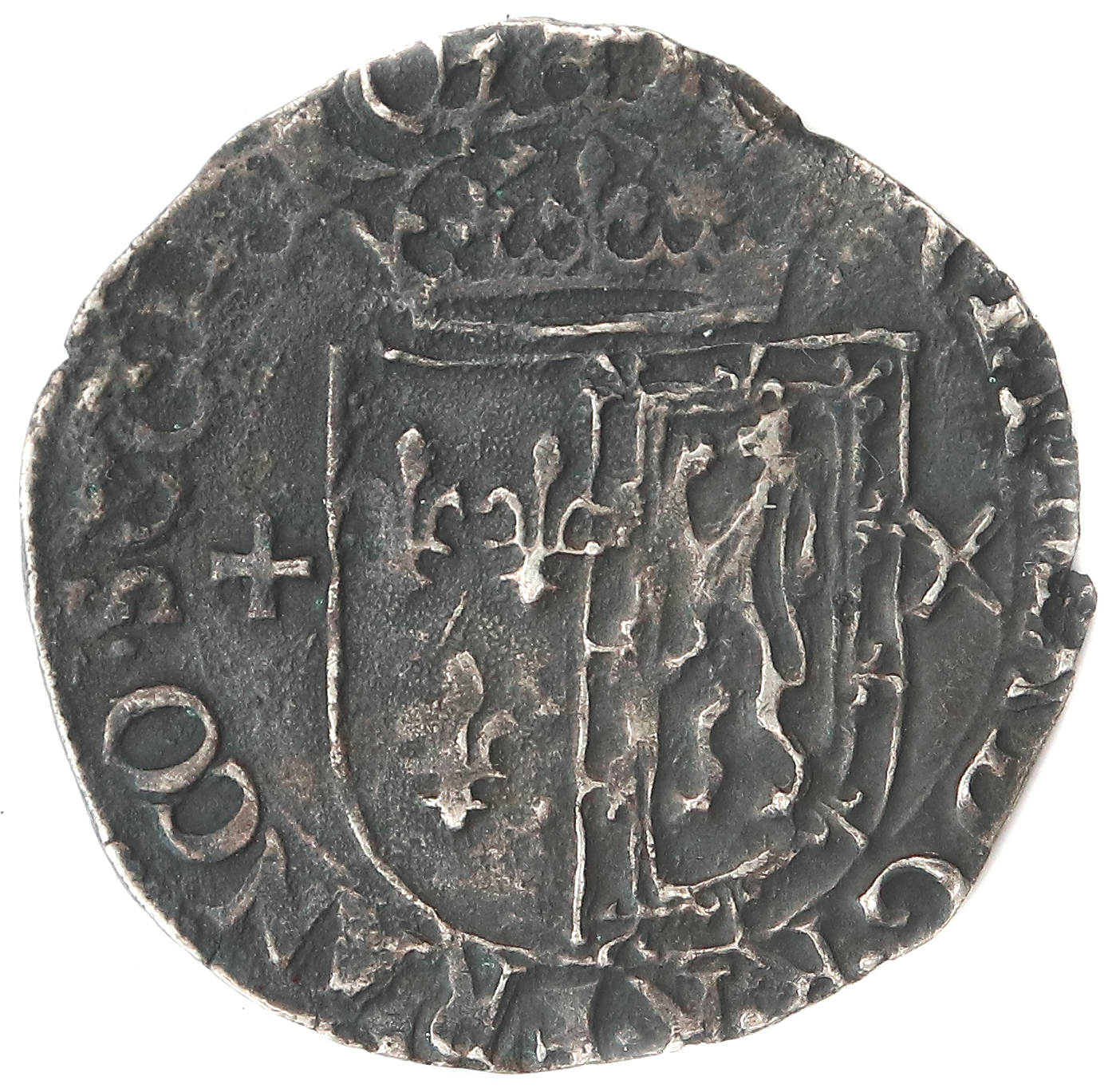 + FRAN. ET. MA. D. G. R. R. FRANCO. SCOTOR. Q. (François II et Marie par la grâce de Dieu, Roi et Reine de France Reine d'Écosse). Écu couronné écartelé de France et d'Écosse, accosté d'une croix et d'une croix de Saint-André. |