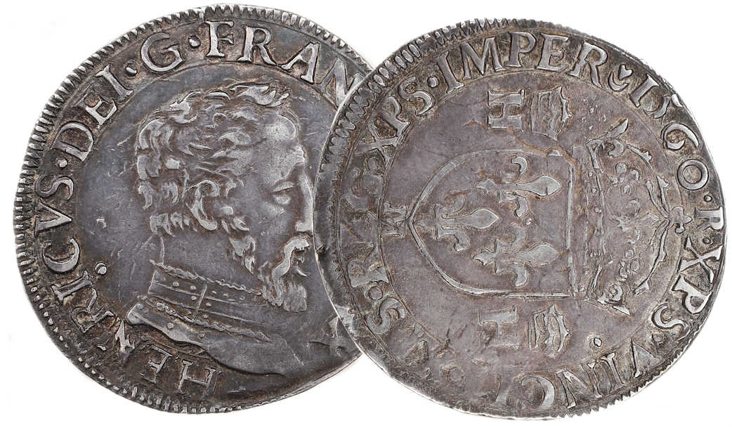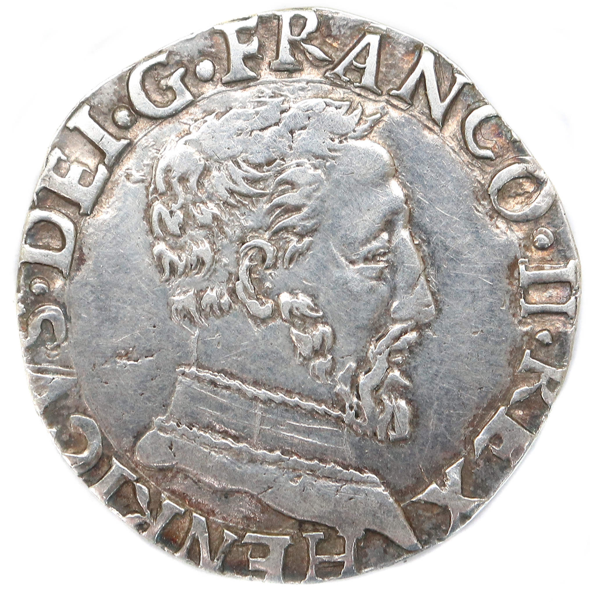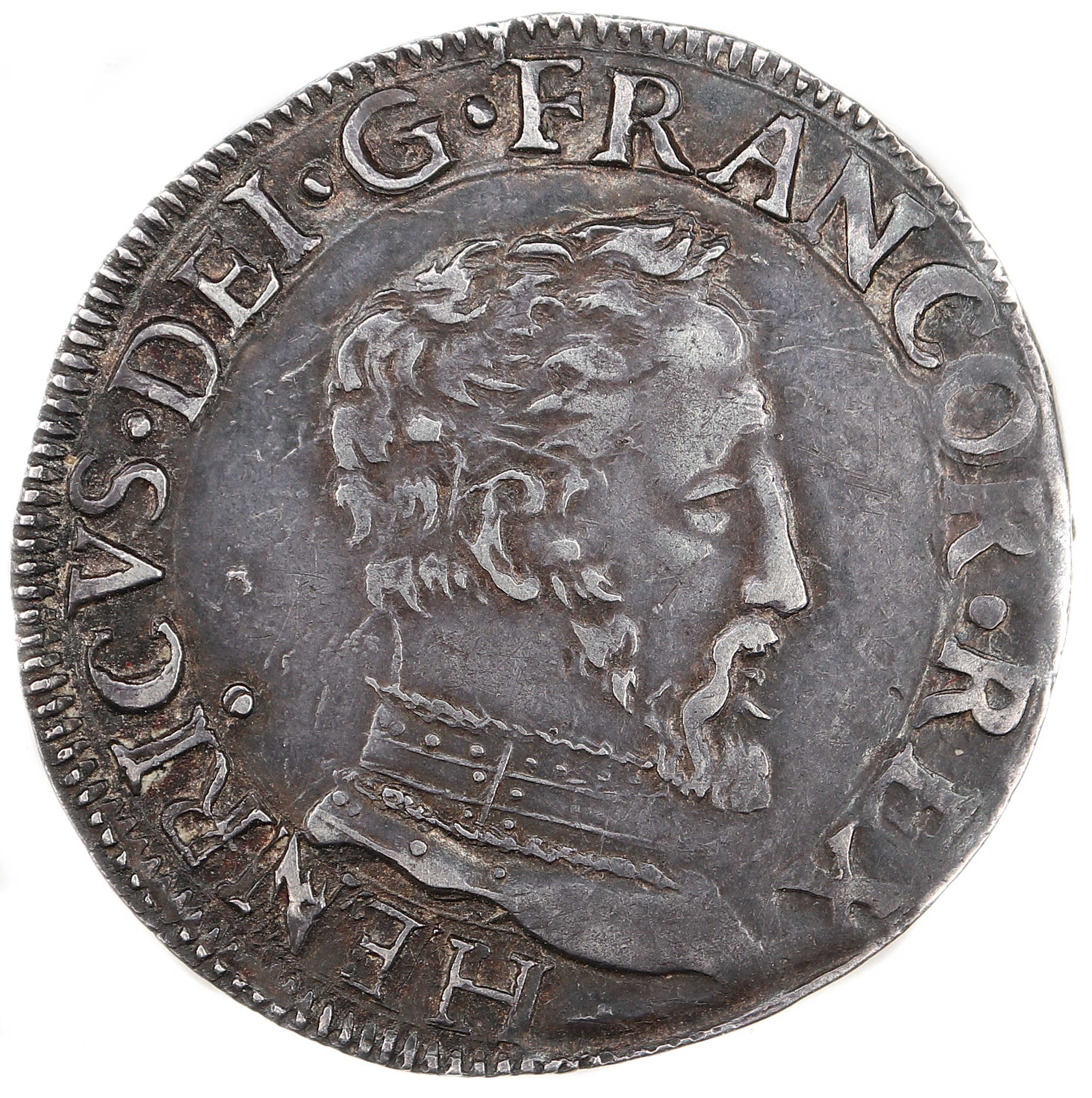 HENRICVS..DEI.G.FRANCOR.REX HENRI , par la grâce de Dieu, roi des Francs Buste du roi à droite, tête nue avec un col |