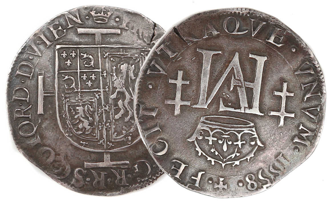 au nom des deux souverains en 1558 et 1559 au type de la monnaie. En 1560, les monnaies furent frappée à un autre type.
