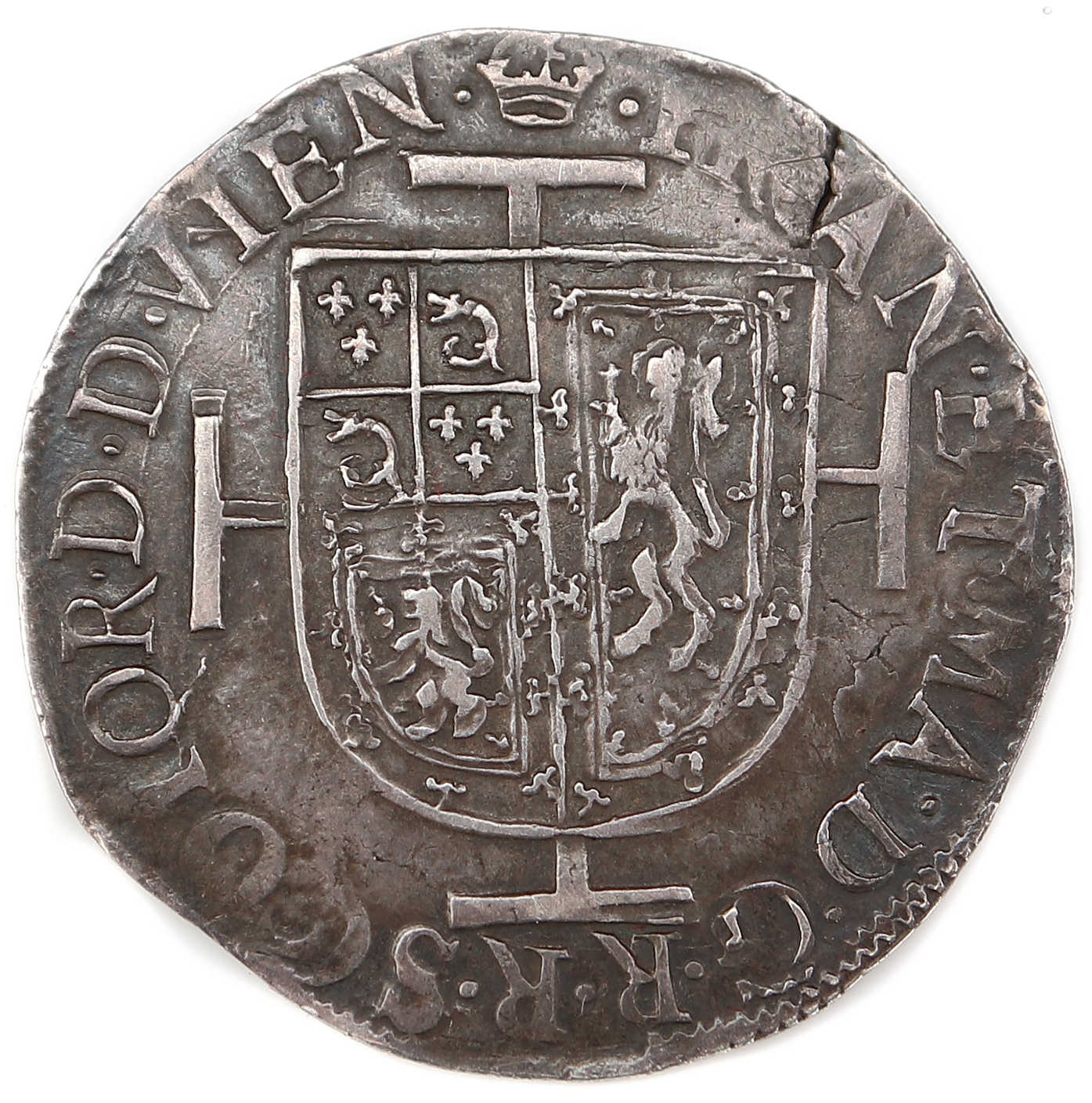 (couronne)FRAN. ET. MA. D. G. R. R.SCOTOR D.D. VIEN. (François et Marie par la grâce de Dieu, Roi et Reine d'Écosse. Dauphin, Dauphine du Viennois). Écu brochant
