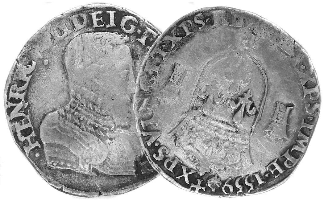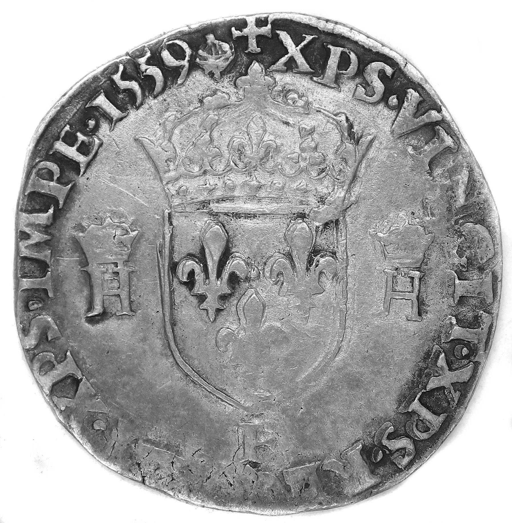 Lettre d'atelier : F Point secret : 7 éme (au droit) Millésime : 1559 Chiffre de frappe connu : 16 065 ex (avec demi testons) Indice de rareté : R3 |