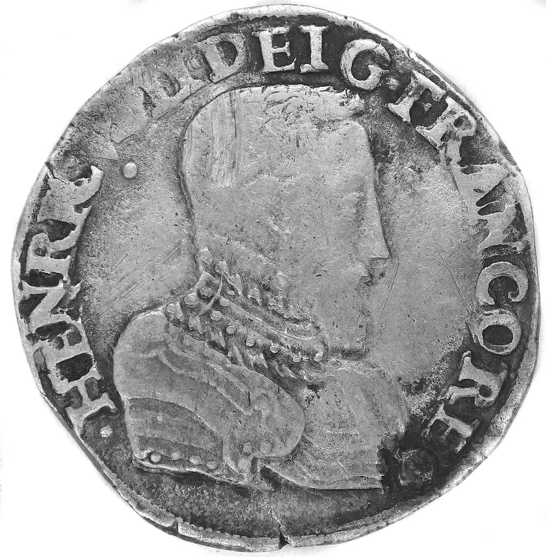 HENRICVS.II.DEI.G.FRANCO.RE (dif) HENRI, par la grâce de Dieu, roi des Francs Buste du roi en cuirasse, à droite |