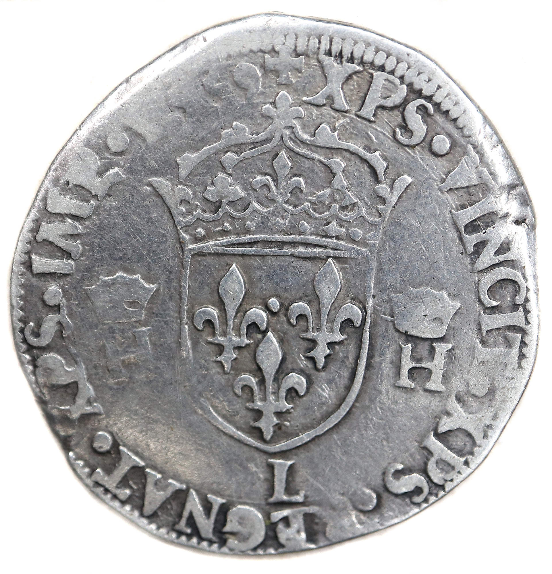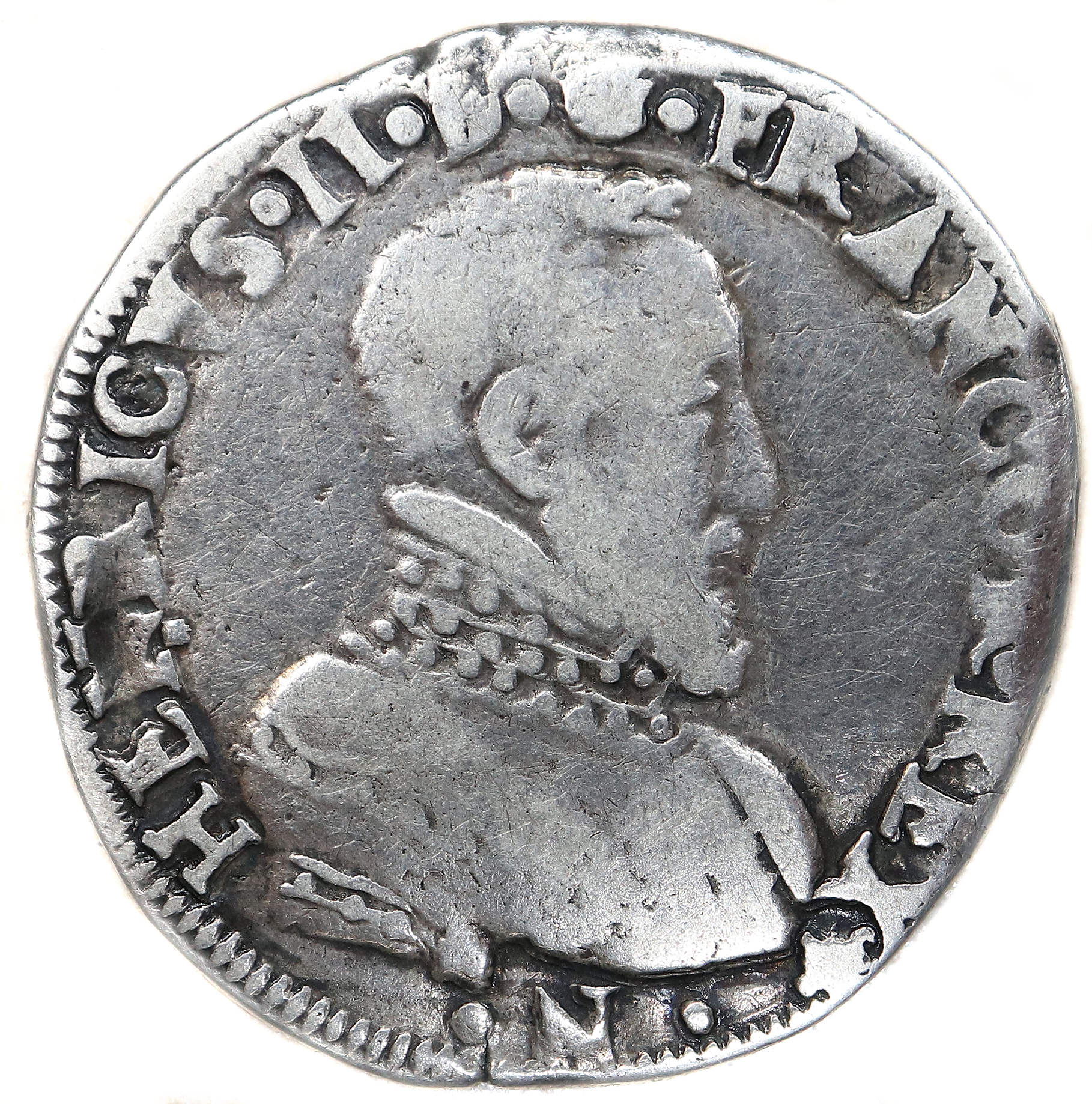 HENRICVS.II.D.G.FRANCOR.REX(ancre) .N. HENRI, par la grâce de Dieu, roi des Francs Buste du roi à droite cuirassé, tête nue |