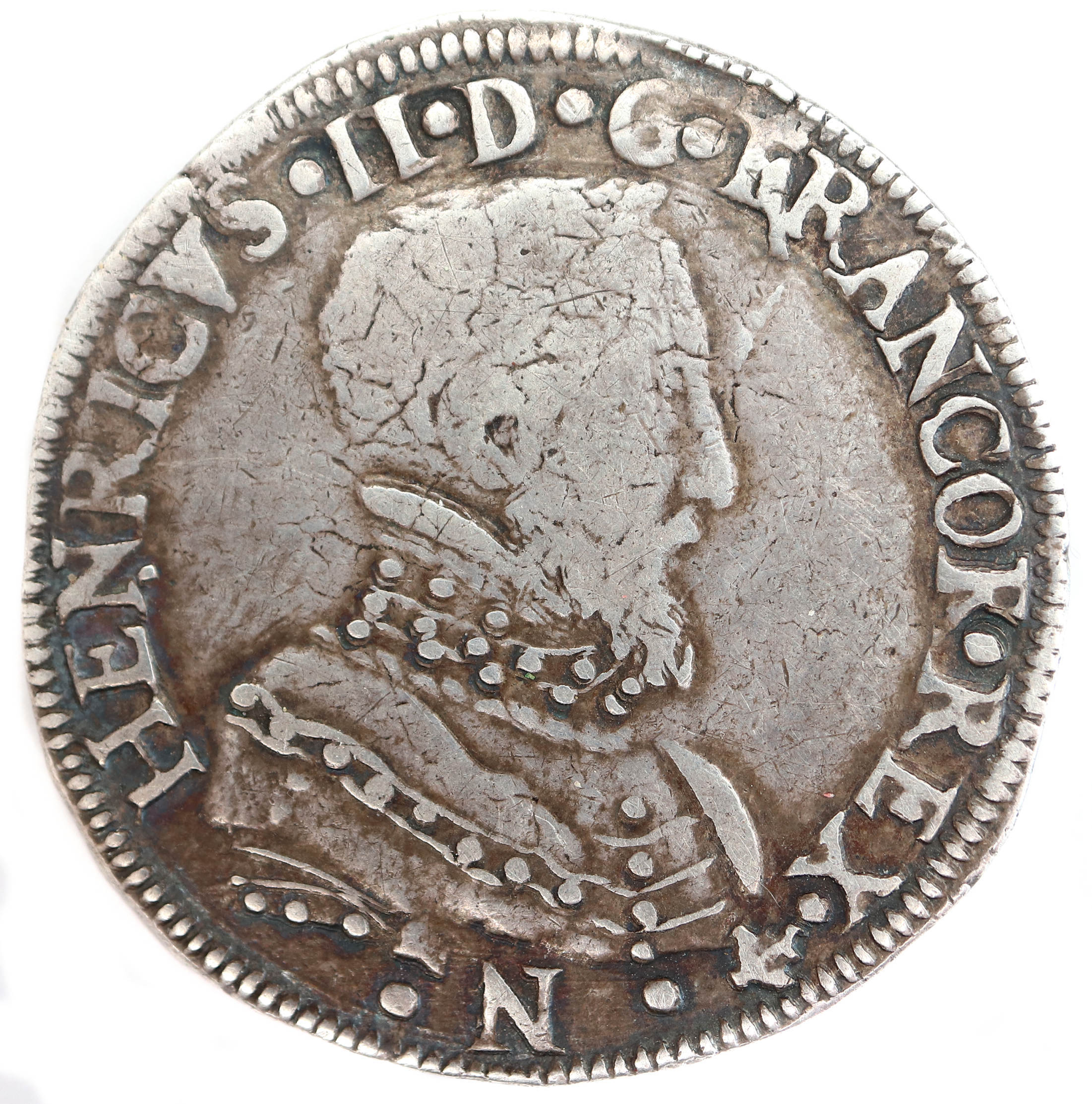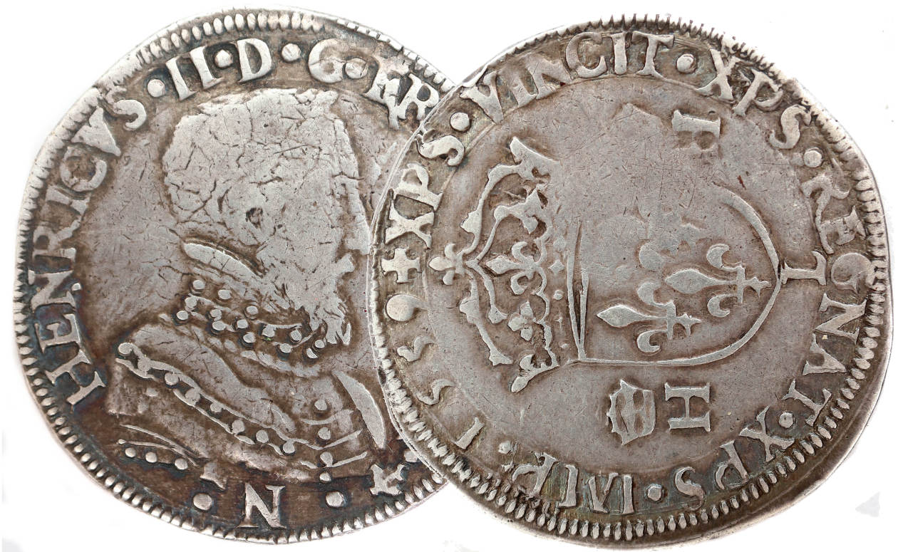 HENRICVS.II.D.G.FRANCOR.REX(ancre) .N. HENRI, par la grâce de Dieu, roi des Francs Buste du roi à droite cuirassé, tête nue |