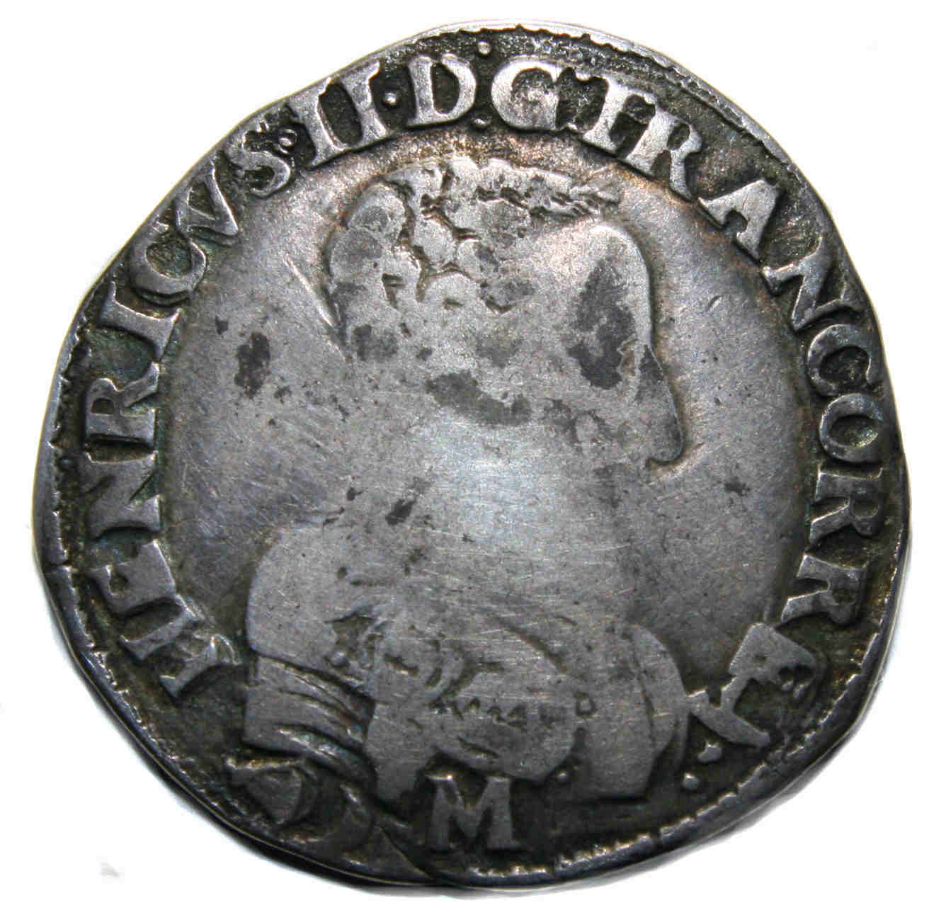 HENRICVS.II.D.G.FRANCOR.REX M (nef sur un croissant) HENRI, par la grâce de Dieu, roi des Francs Buste du roi à droite avec cuirasse damasquinée |