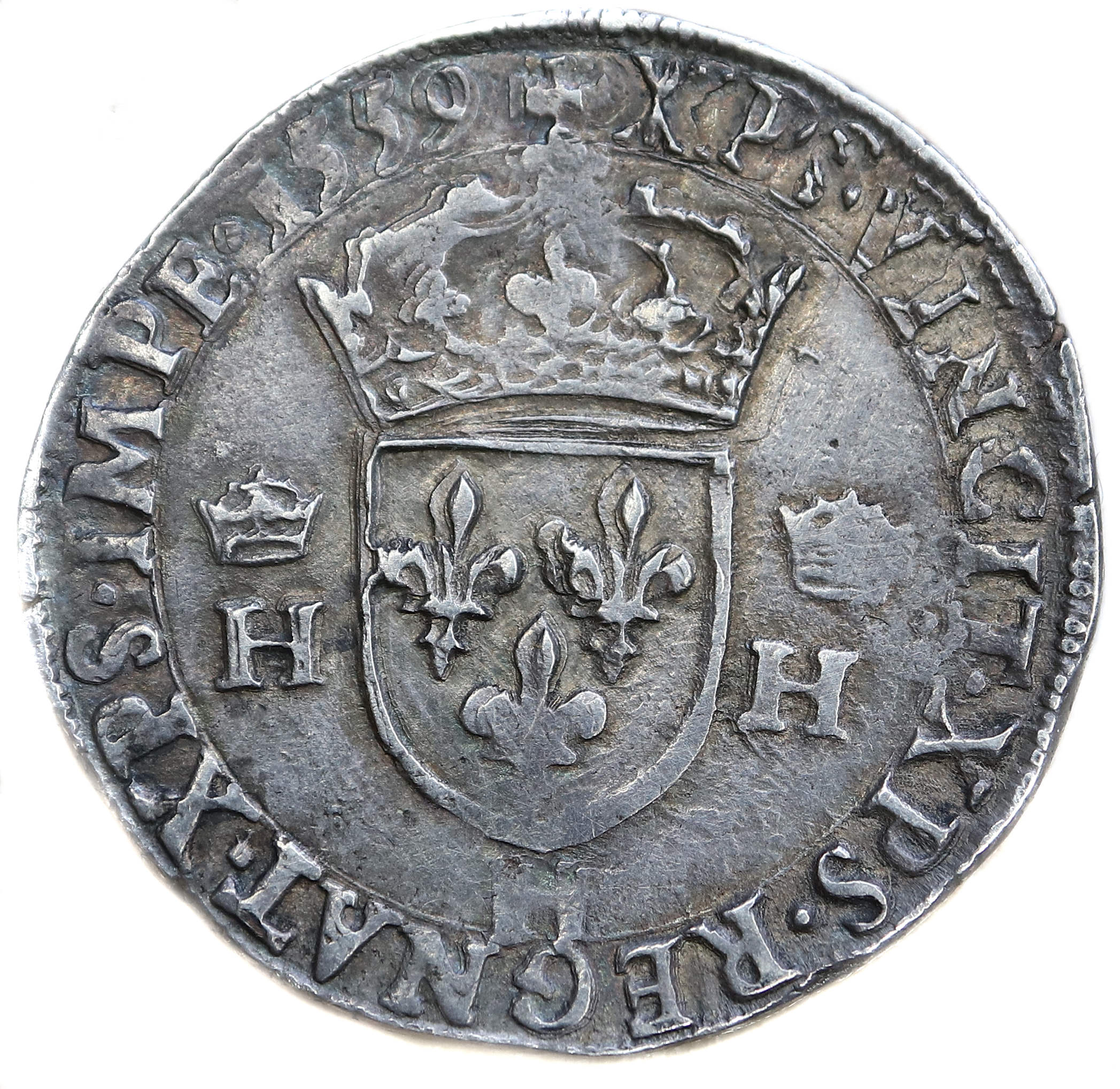 HENRICVS.II.D.G.F.REX .(dif) HENRI, par la grâce de Dieu, roi des Francs Buste du roi à droite avec cuirasse cloutée |
