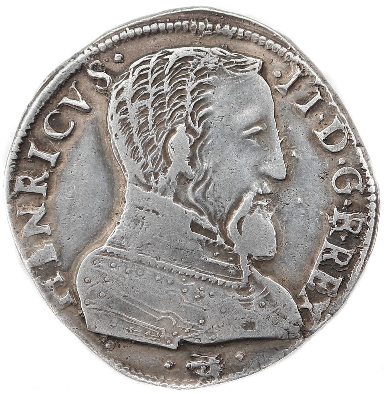 HENRICVS.II.D.G.F.REX .(dif) HENRI, par la grâce de Dieu, roi des Francs Buste du roi à droite avec cuirasse damasquinée |