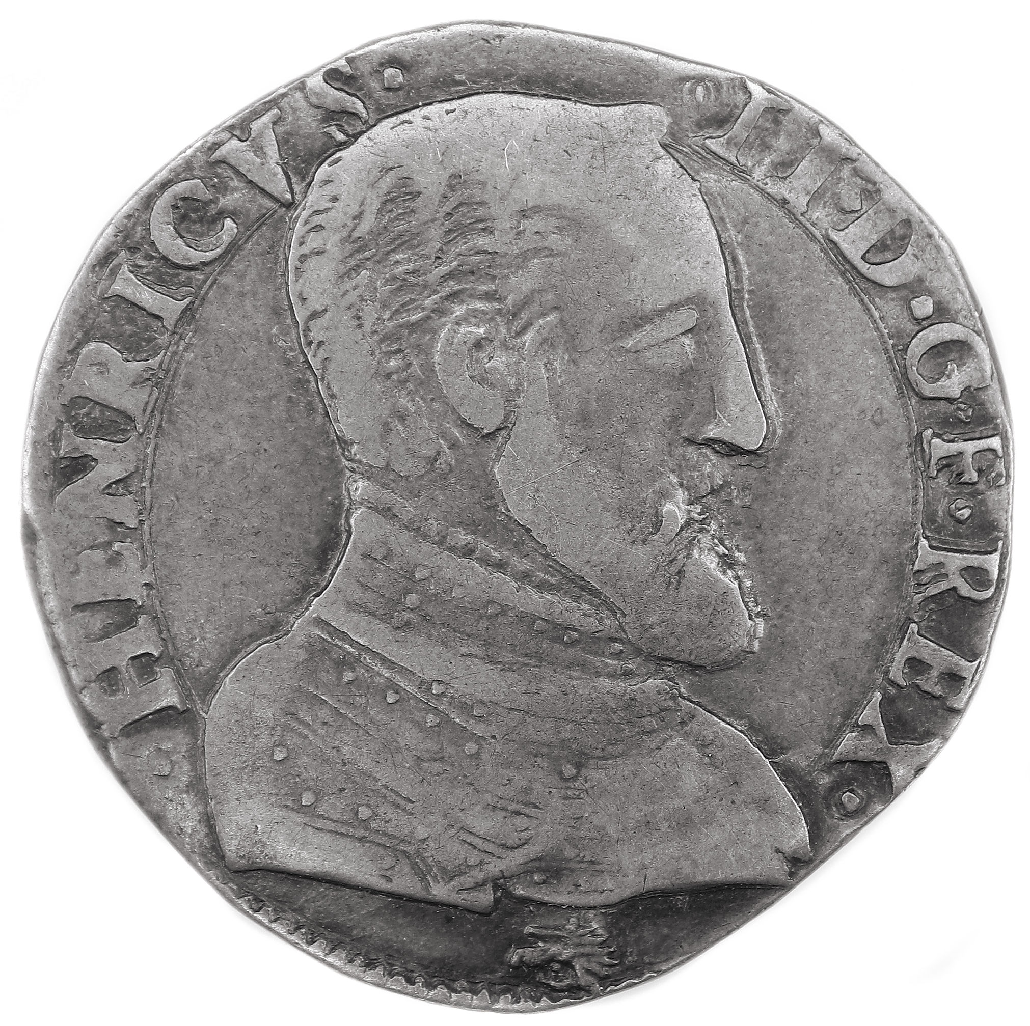 HENRICVS.II.D.G.F.REX. (dif) HENRI, par la grâce de Dieu, roi des Francs Buste du roi à droite avec cuirasse damasquinée |