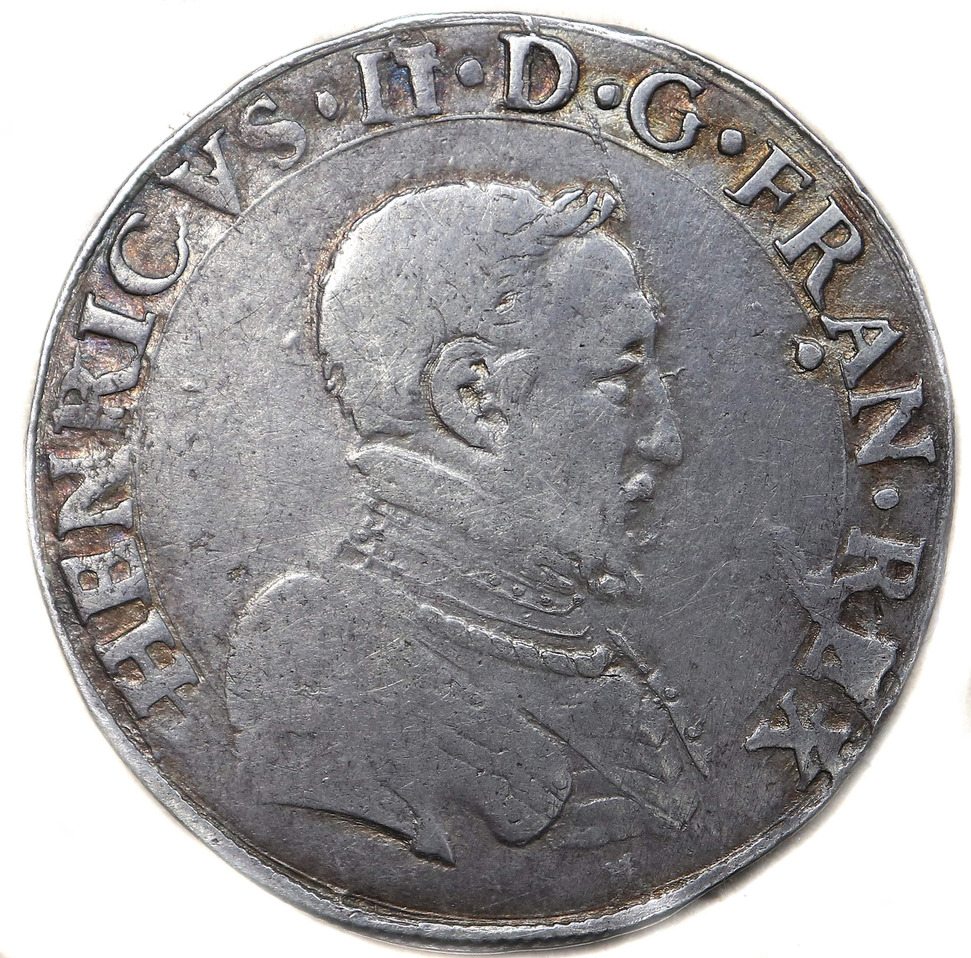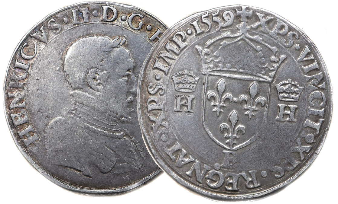 HENRICVS.II.D.G.FRAN.REX . HENRI, par la grâce de Dieu, roi des Francs Buste du roi en cuirasse, à droite |