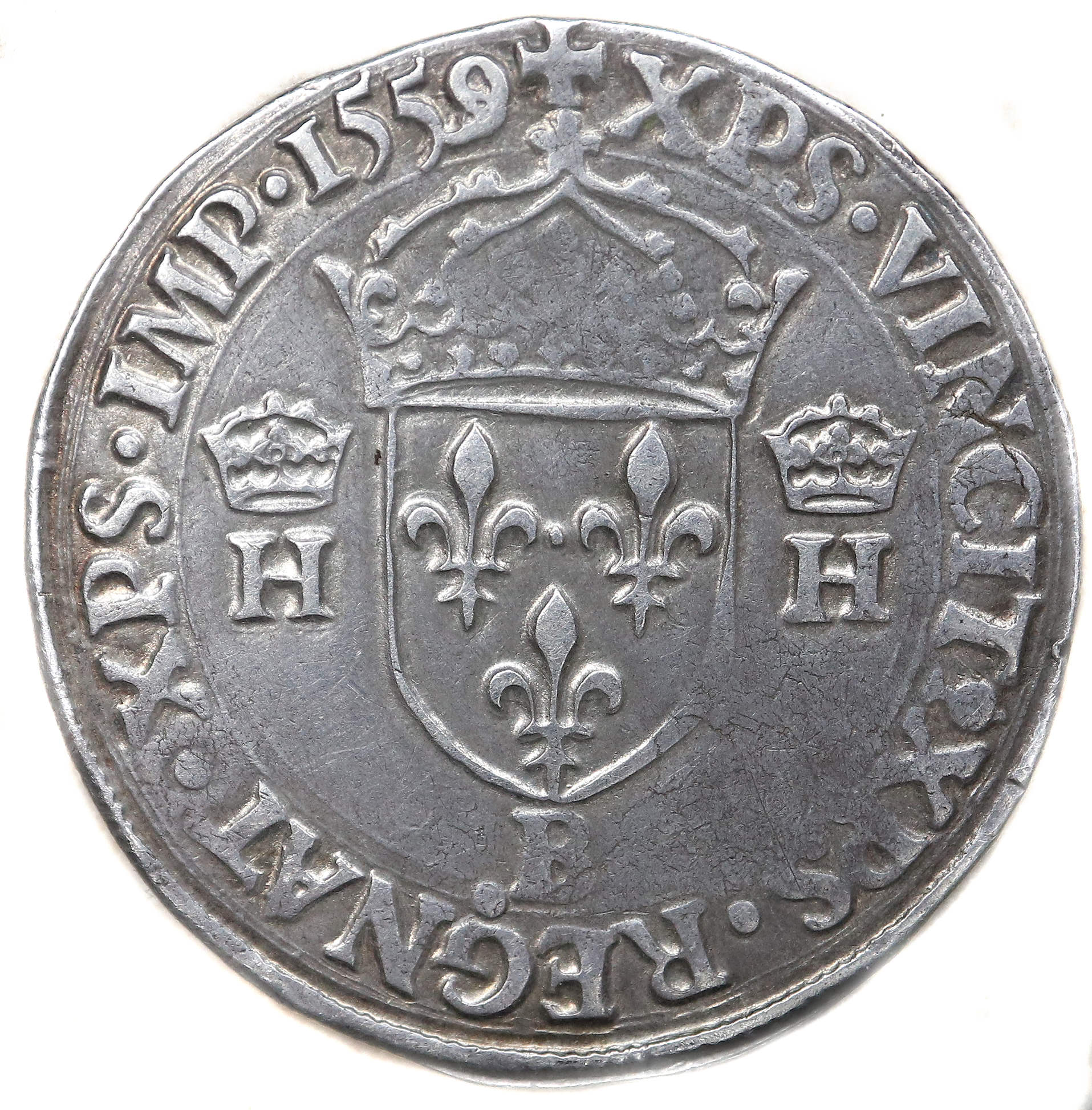 Lettre d'atelier : B Point secret : 15éme (au droit et au revers) Millésime : 1559 Chiffre de frappe connu : 49 801 ex (avec demi