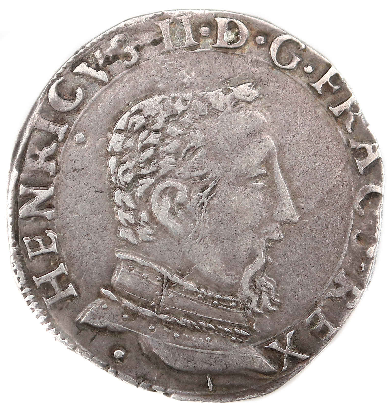 HENRICVS.II.D.G.FRACO.REX. HENRI, par la grâce de Dieu, roi des Francs Buste du roi tête nue à droite avec cuirasse; |