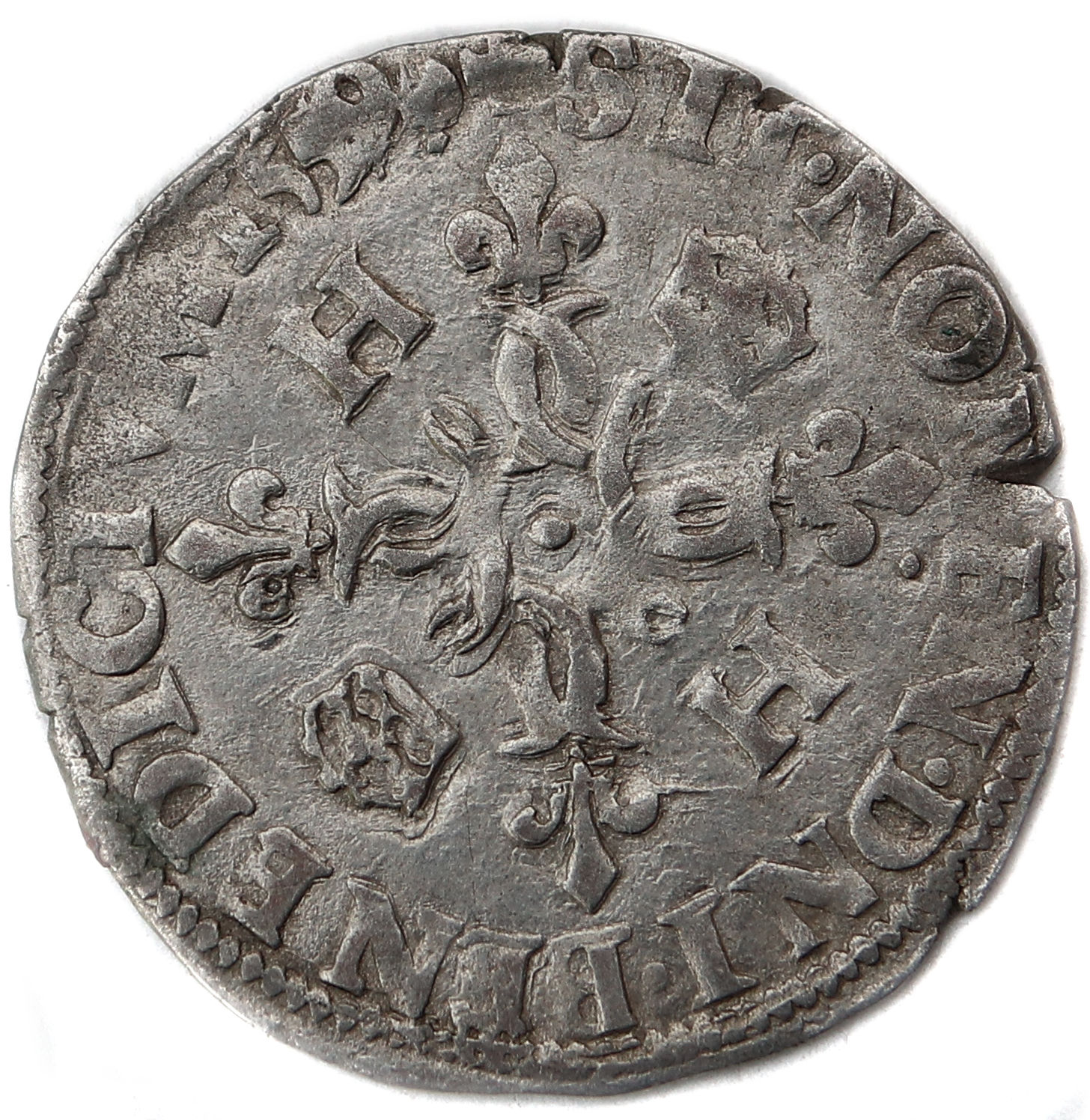 Lettre d'atelier : F Point secret : Oui (7éme au droit et au revers) Millésime : 1559 Chiffre de frappe connu : 60 480 ex |