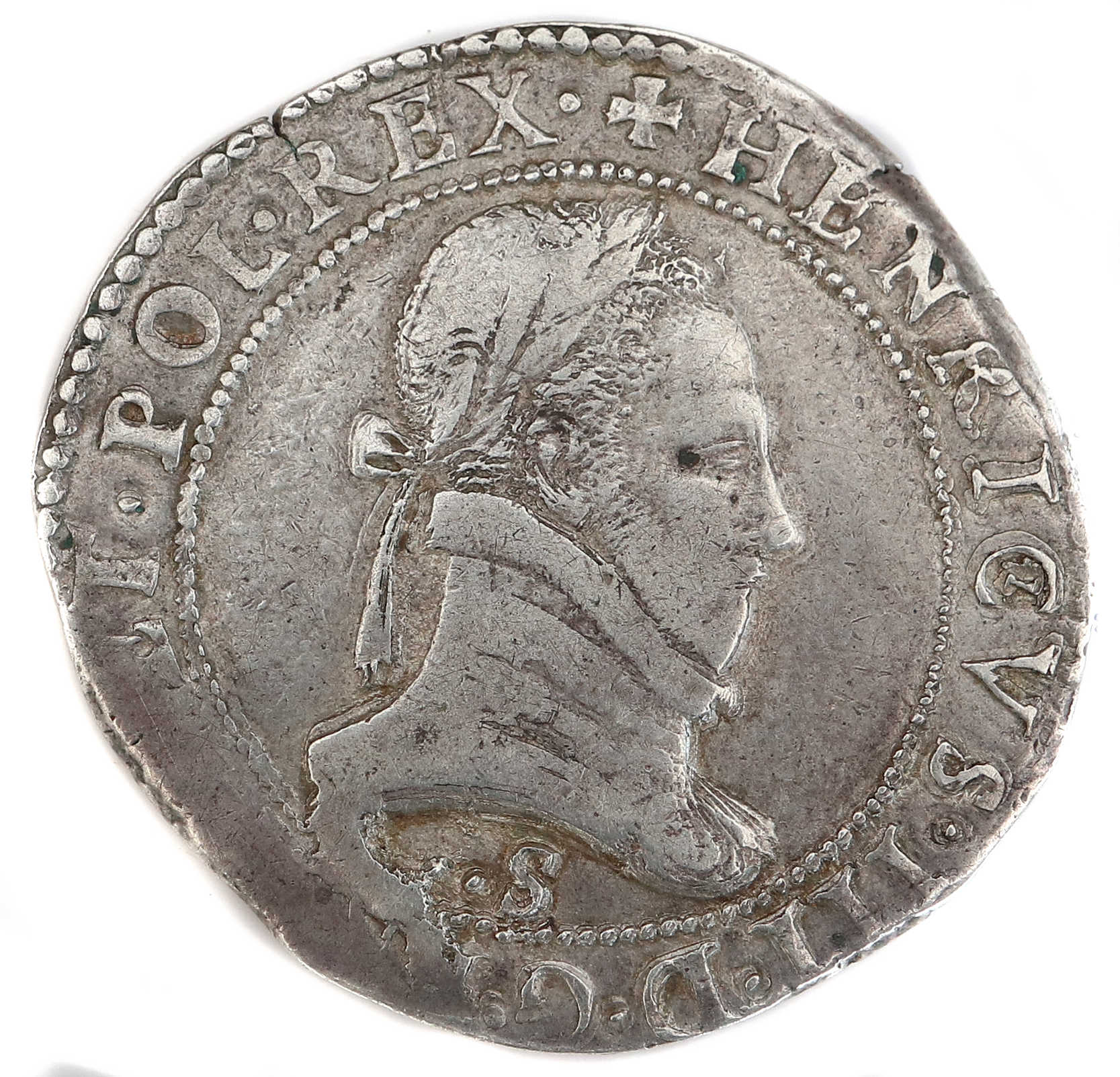 + HENRICVS III.D.G.FRANC.ET.POL.REX.1579 Henri III par la grâce de Dieu roi des Francs et des Polonais. Buste lauré et cuirassé à droite. Col plat. Lettre d'atelier sous l'effigie |