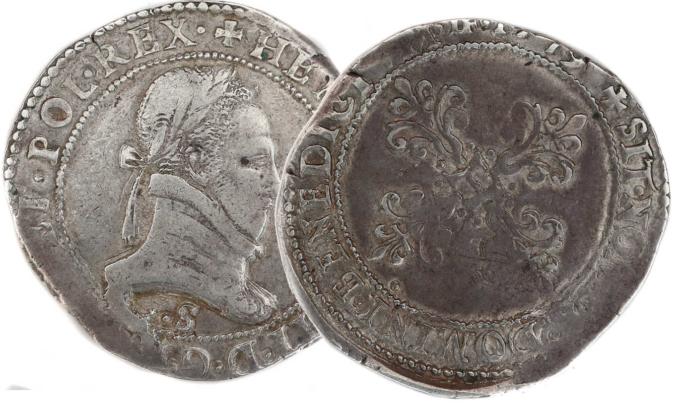 Lettre d'atelier : S (au droit sous l'effigie) Point secret : Oui (14éme) Millésime : 1579 Chiffre de frappe connu : 28 756 (avec 1/2 et 1/4 de franc) |
