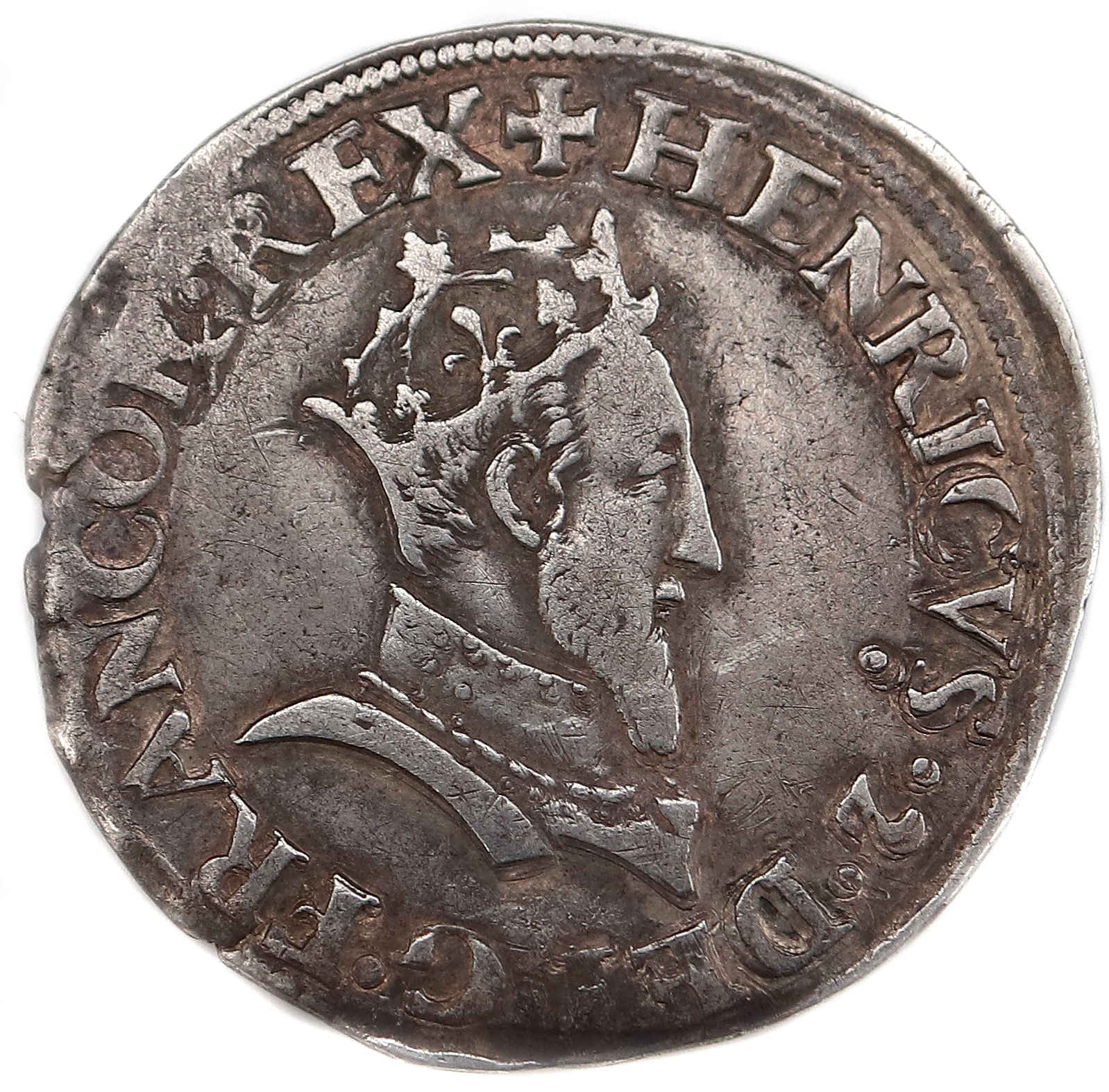 +HENRICVS.2..DEI.G.FRANCOR..REX. Henri II par la grâce de Dieu roi des Francs Buste du roi, tête couronnée, cuirassé à droite |