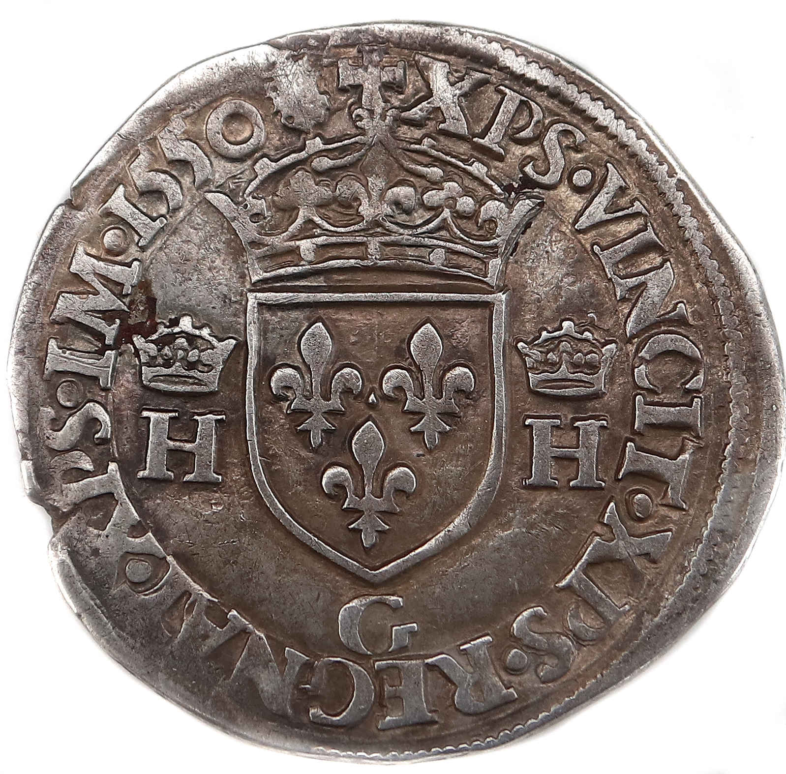 Lettre d'atelier : G (au revers sous l'écu) Point secret : 8 éme (au droit) Millésime : 1550 Chiffre de frappe connu : 9 252 ex (avec testons) Indice de rareté : R4 |