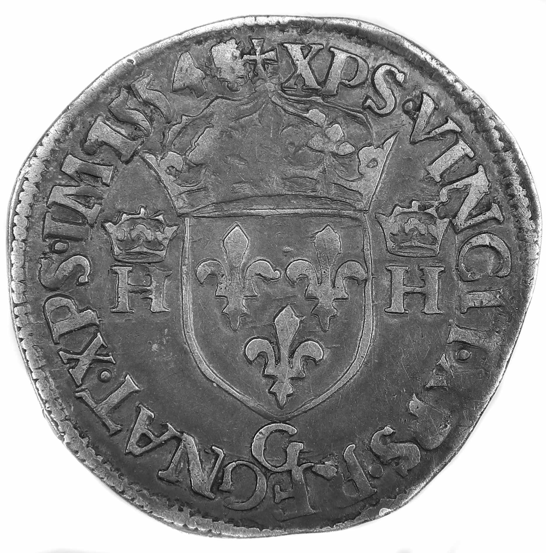 Lettre d'atelier : G (au revers sous l'écu) Point secret : Non Millésime : 1554 Chiffre de frappe connu : 210