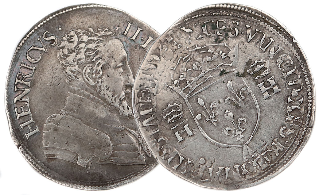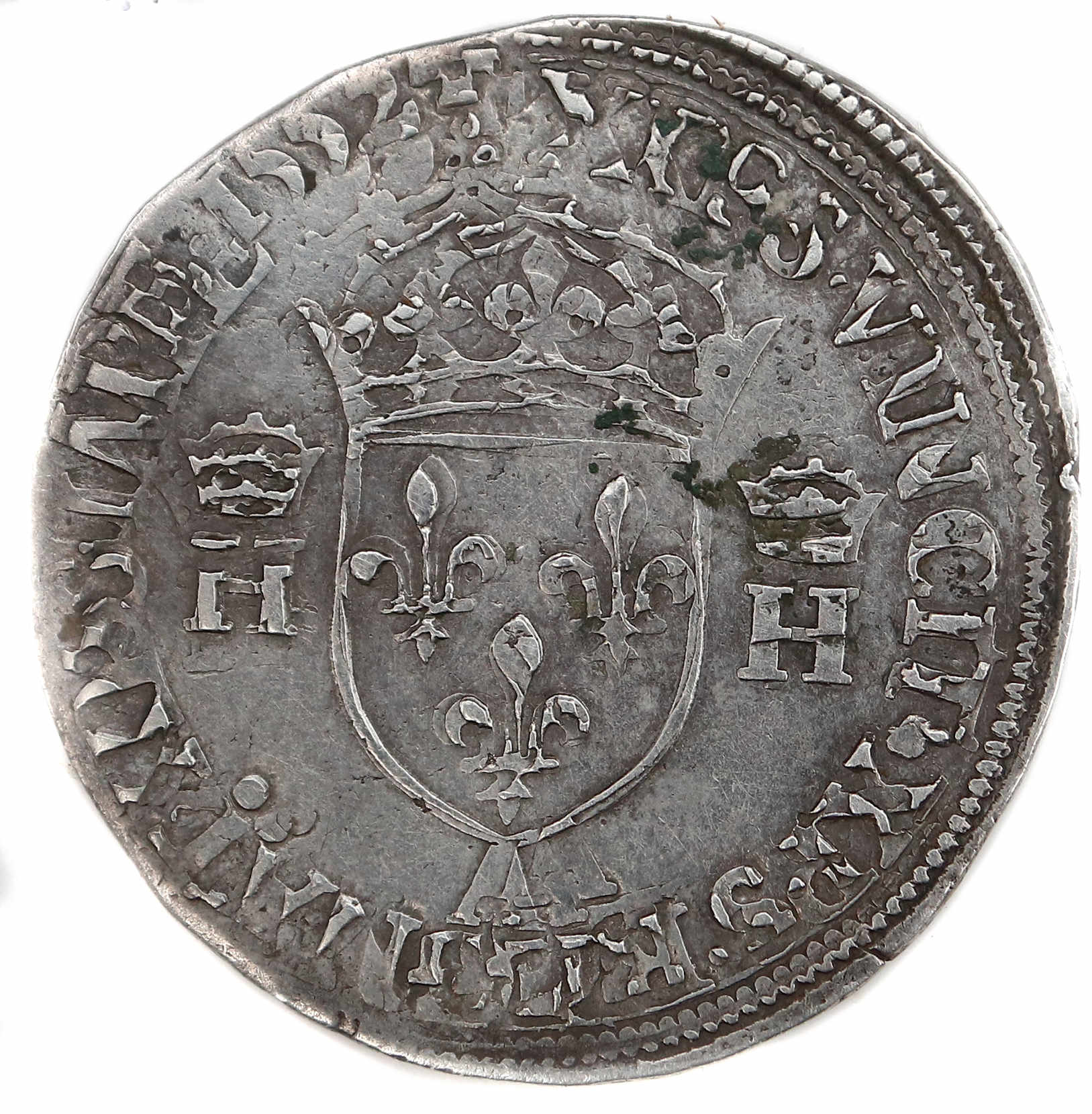 1554 à 1558 les testons furent frappés au buste lauré au Moulin. La monnaie présente un trés bel avers avec une effigie du roi trés nette. Au revers on note un important tréflage résultantd'une triple frappe. Voir autre exemplaire. Axe des coins : 11 h. |