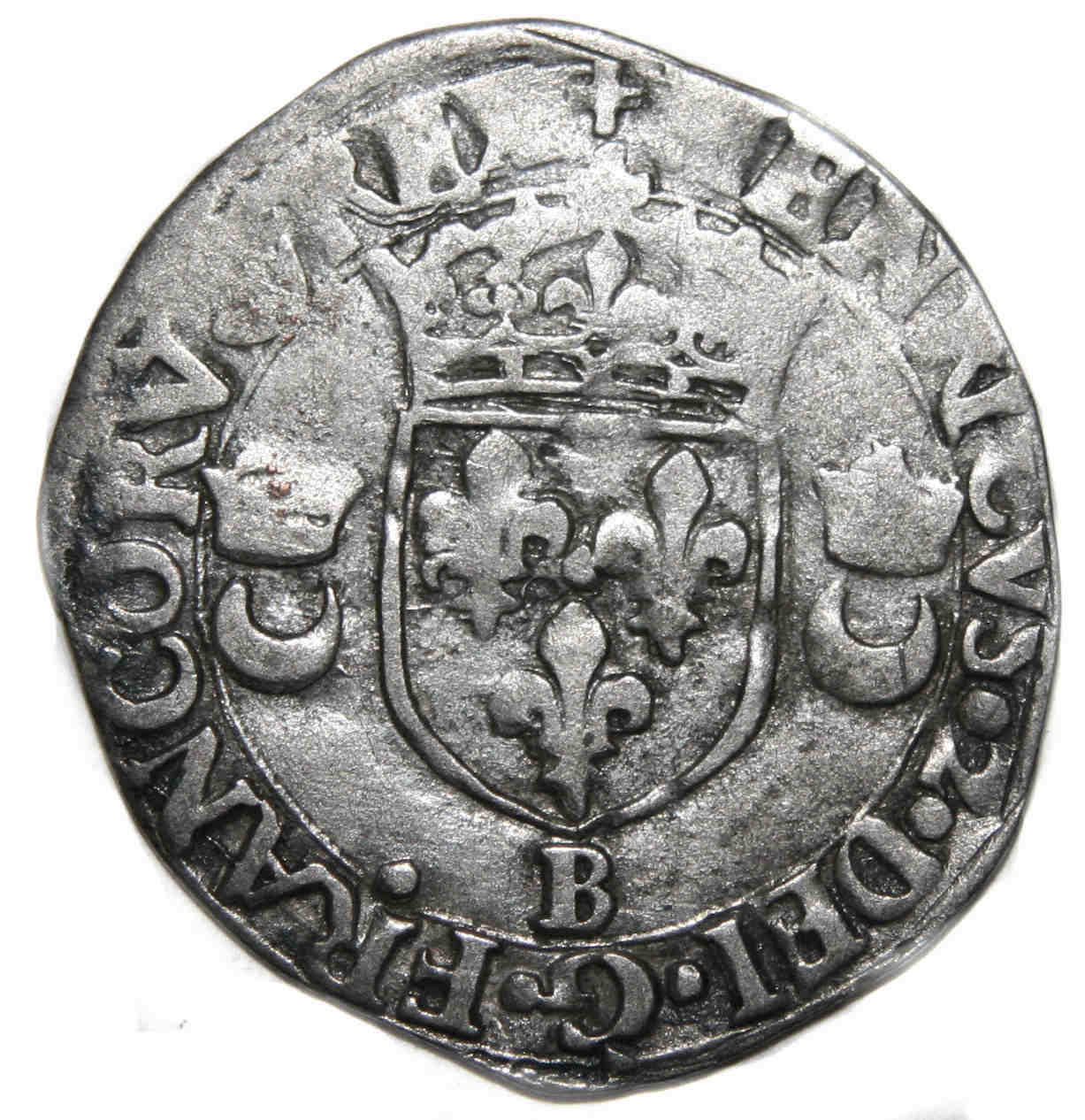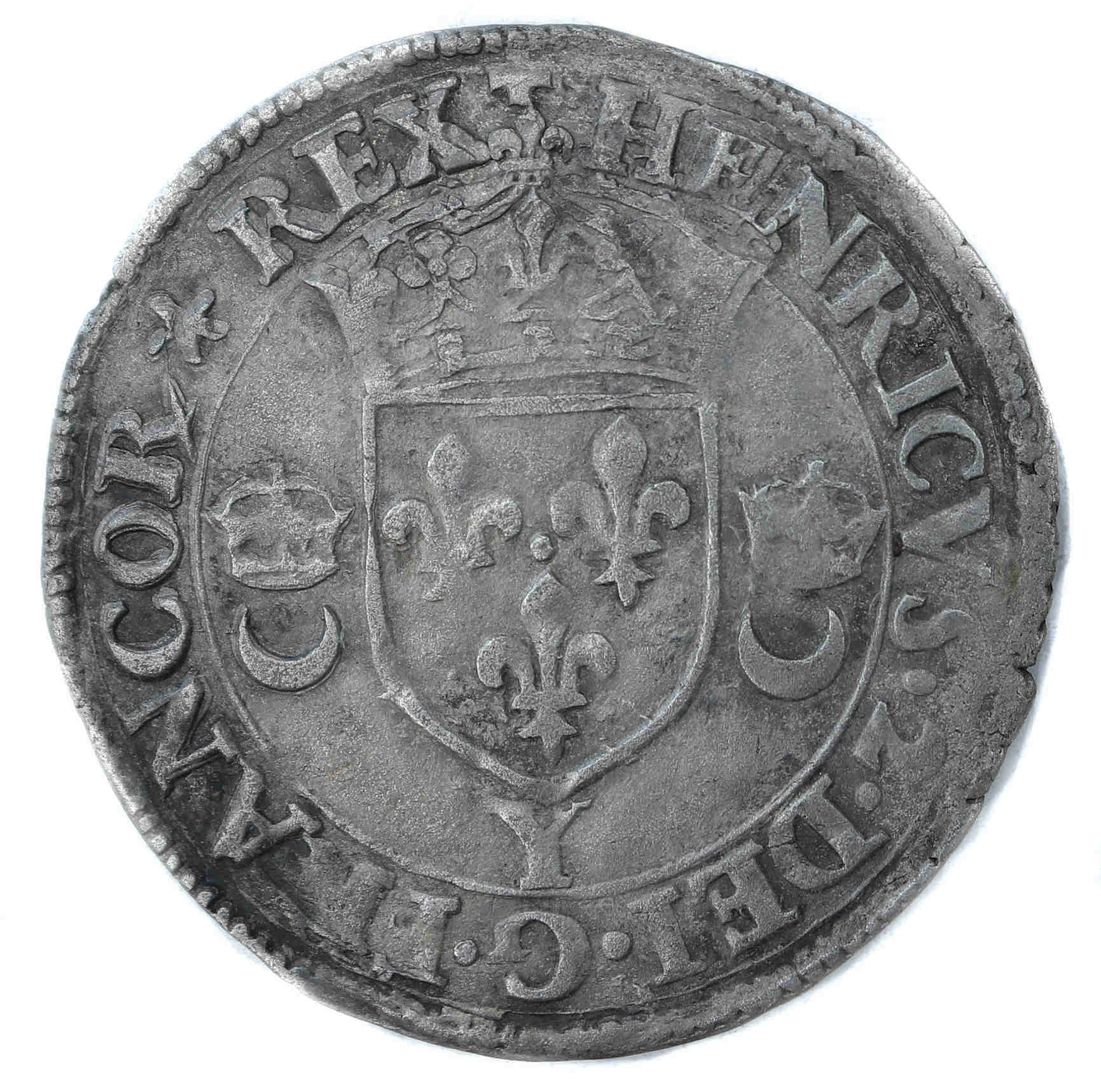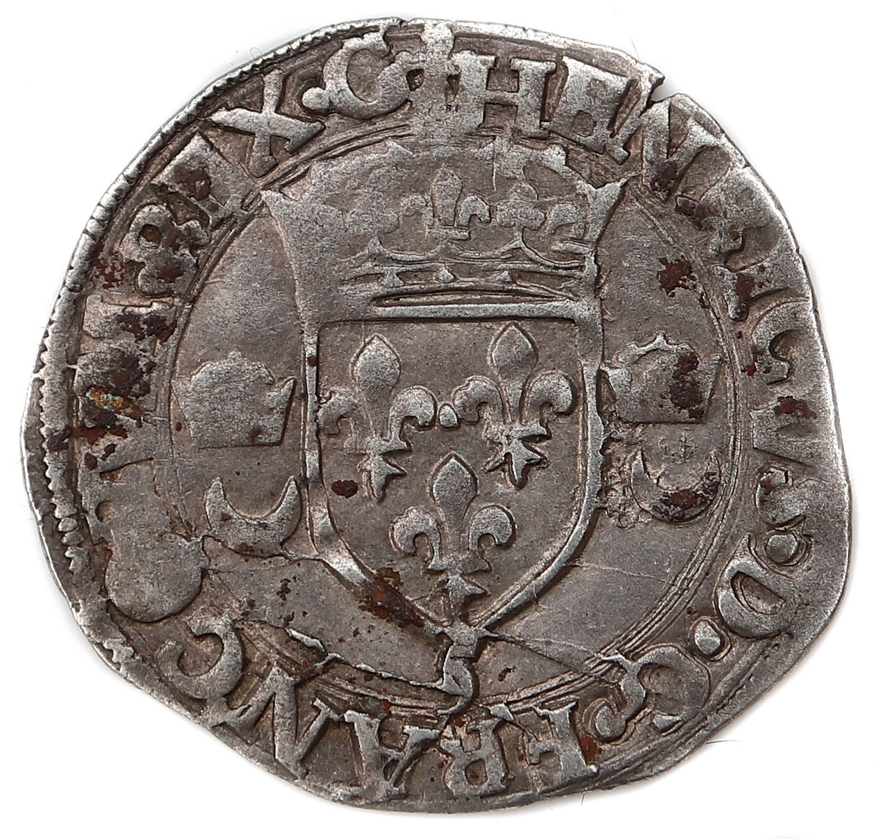 +HENRICVS.D.G.FRANCORVM.REX.G Henri par la grâce de Dieu roi des Francs Ecu de France couronné entre