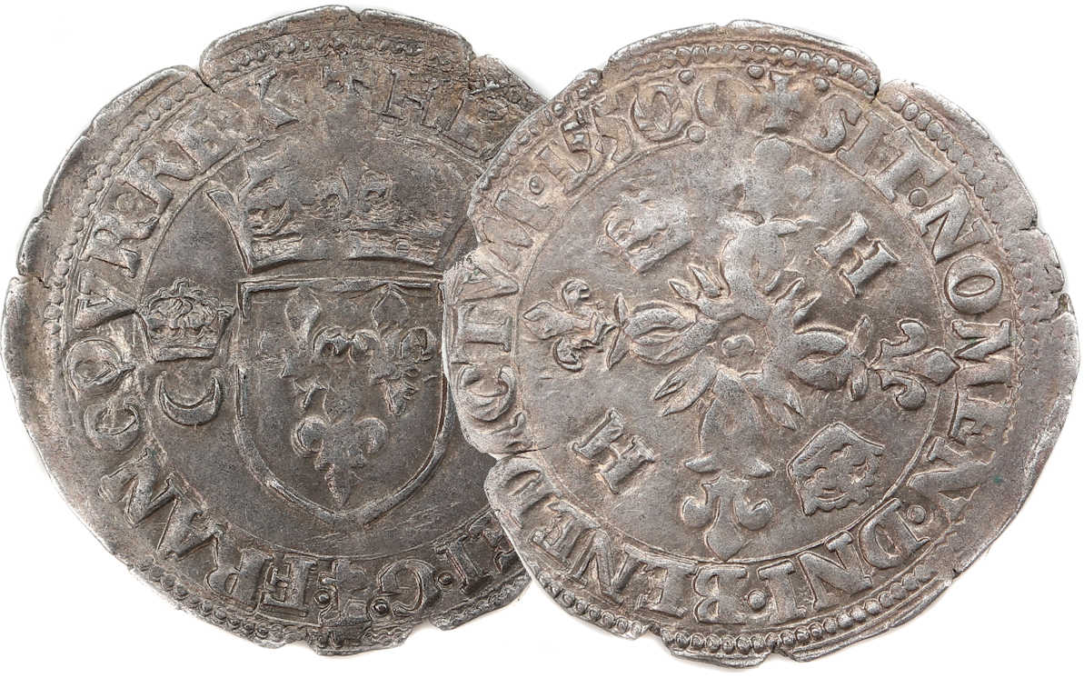 période 1546-1552. Le flan présente du multipes échancrures. La frappe au droit est faible. A noter l'erreur dans la légende FRANCOVR . Axe des coins : 12 h |