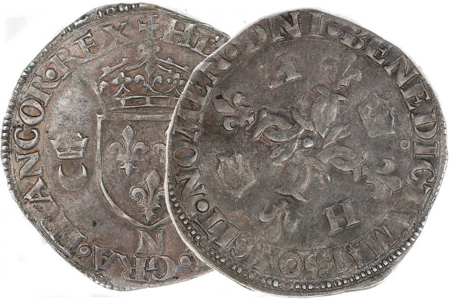 monnaies de 1551 seront encore frappées avec le N et l'hermine. , Les douzains au croissant se trouvent trés fréquemment en mauvais état dans les plateaux des marchands et collectionneurs. La monnaie se distingue par un état général plus que correct avec une frappe bien marquée tant au droit qu'au revers et une usure peu importante. Dans l'ouvrage de S.SOMBART paru aux Editions Gadoury en 2022, il est précisé que pour le millésime 1551 on trouve un annelet 5éme au droit et 17éme au revers. On peut constater sur la monnaie que c'était déjà le cas pour certaines monnaies au millésime 1550. Pédigrée : VSO 48 C.G.B (2011) avec la description : "Ce douzain est frappé sur un flan large, irrégulier et légèrement concave au revers. Exemplaire présentant de hauts reliefs et une petite tache sur le N de HENRICVS". Axe des coins : 7 h |