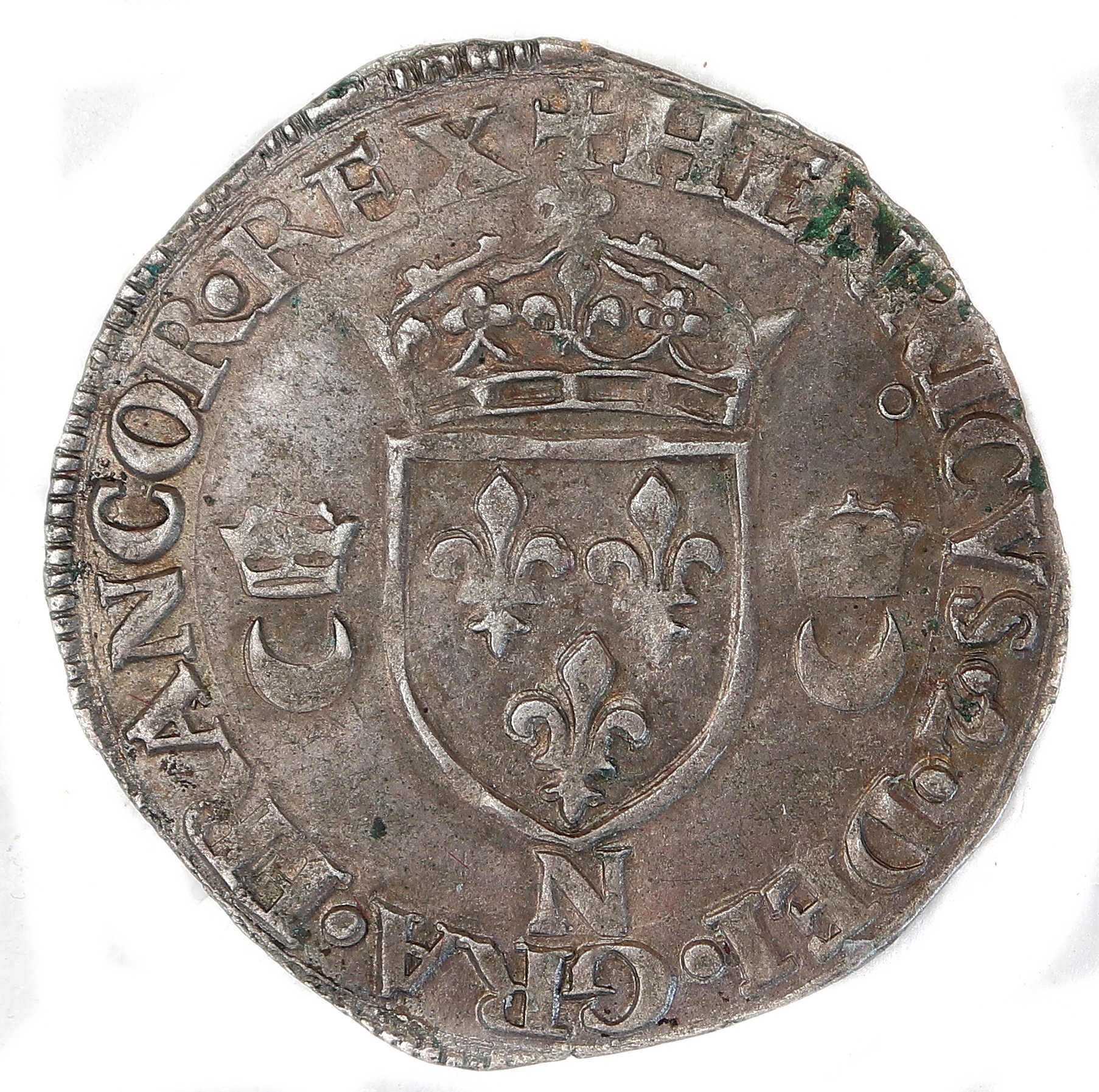 +HENRICVS.2..DEI.GRA.FRANCOR.REX. N Henri II par la grâce de Dieu roi des Francs Ecu de France couronné entre