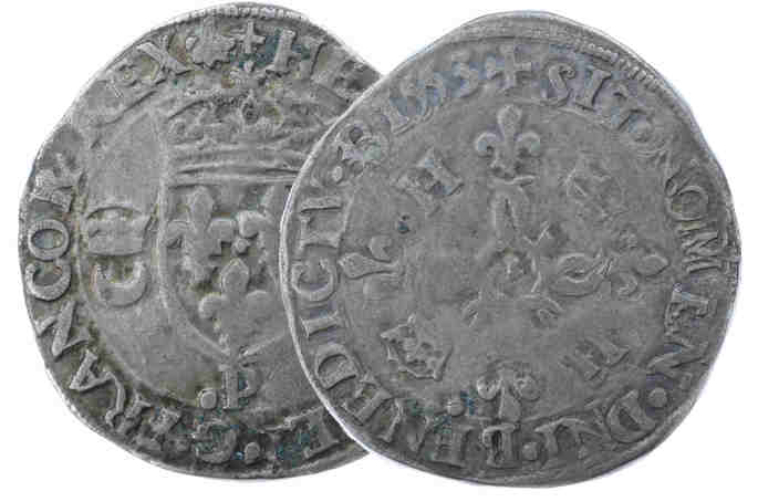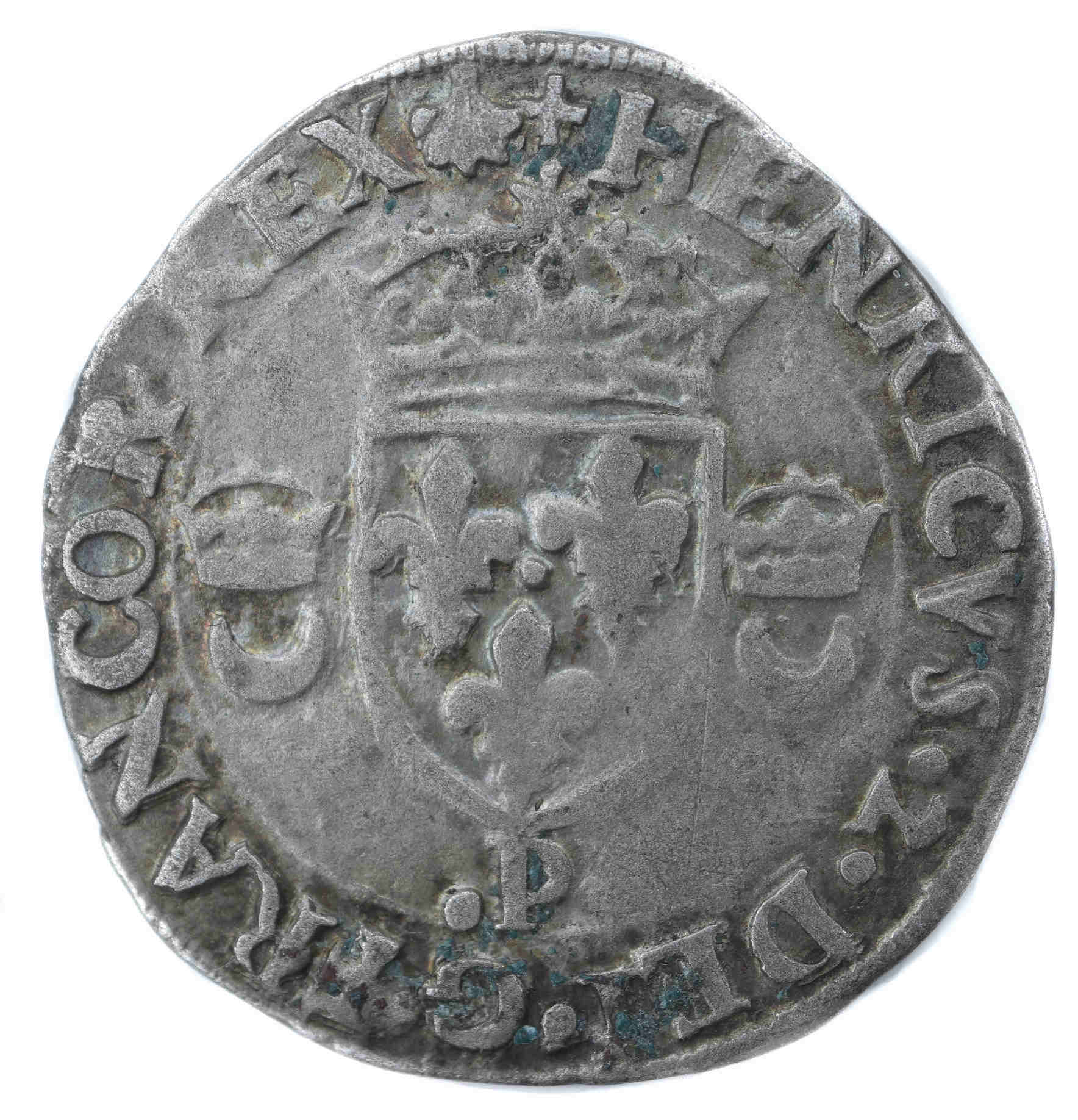 Lettre d'atelier : P (au droit sous l'écu) Point secret : 13éme (au droit et au revers) Millésime : 1553 Chiffre de frappe connu : 63 360 ex Indice de rareté : R5 |