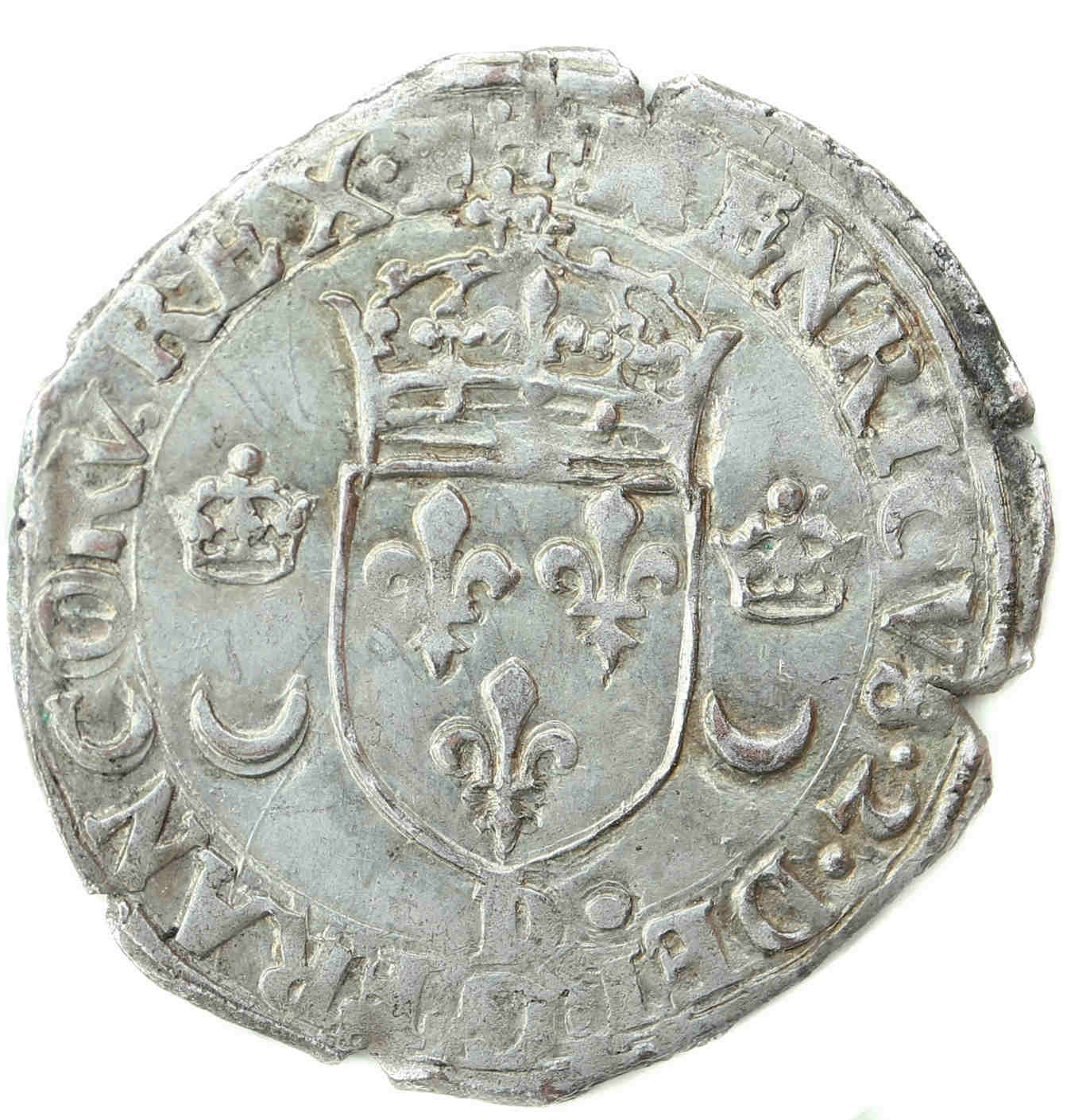 d'Hughes THURY (T) à compter de juillet. Frappés en grand nombre, de faible aloi et ayant circulés intensément les douzains aux croissants sont rarement en bon état. La monnaie présente une certaine usure mais reste correcte. Axe des coins : 3 h |