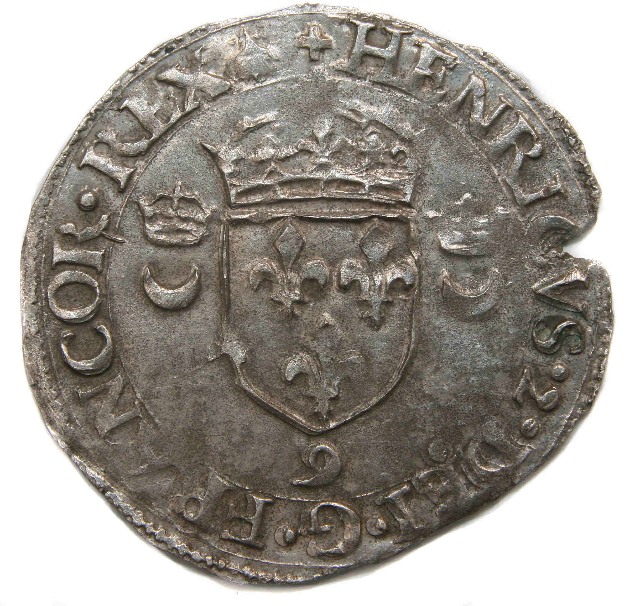 +HENRICVS.2..DEI.G.FRANCOR.REX(dif) 9 Henri II par la grâce de Dieu roi des Francs Ecu de France couronné entre