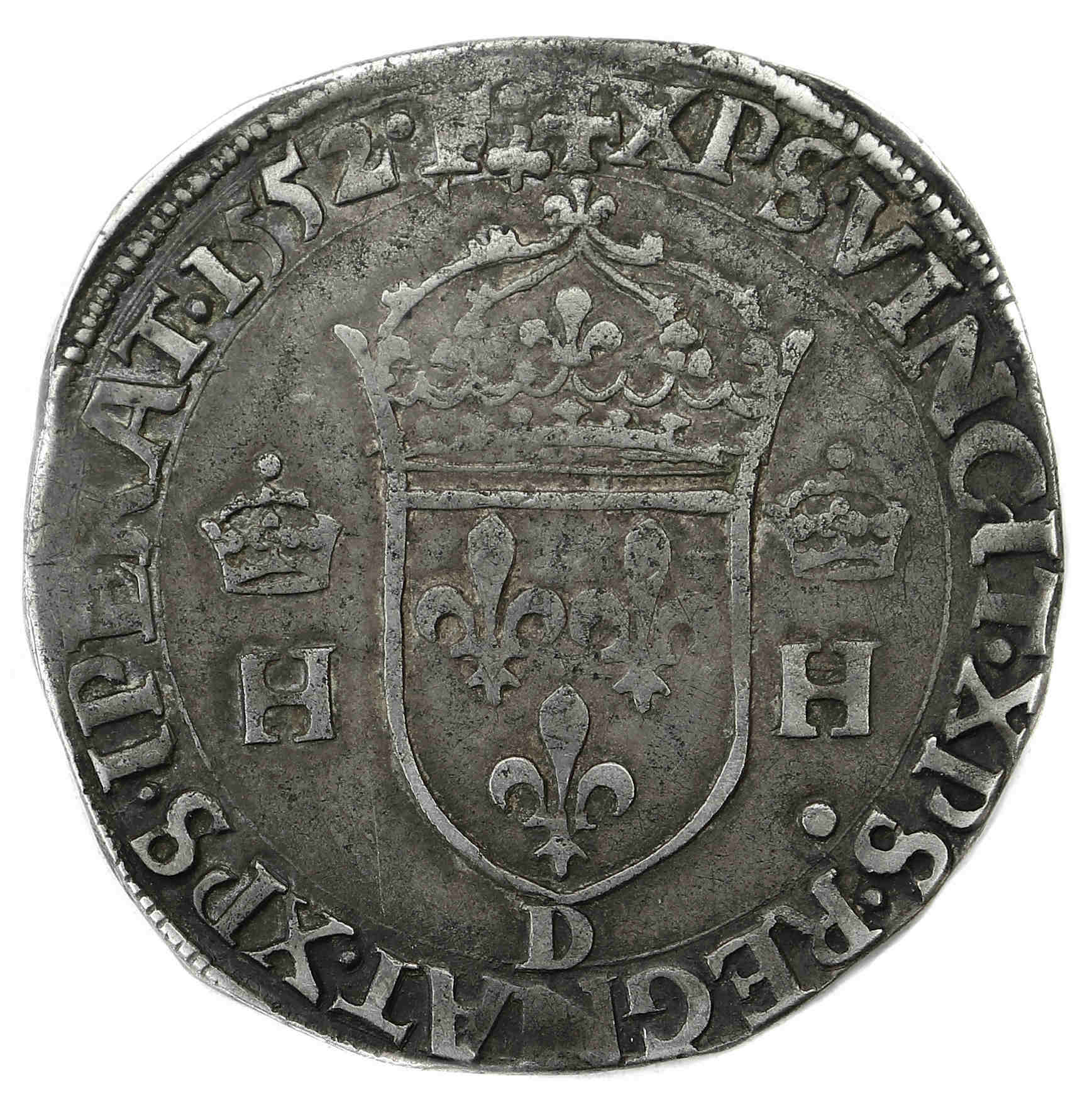 Lettre d'atelier : D (au revers sous l'écu) Point secret : OUI (12éme au droit et au revers) Millésime : 1552 Chiffre de frappe connu : 161