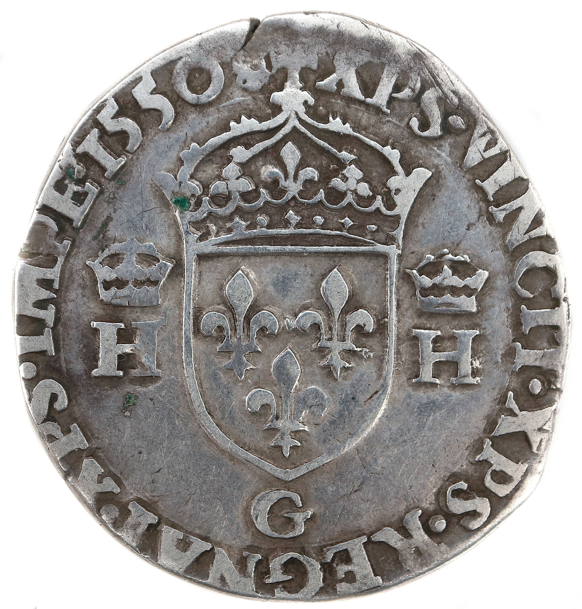 Lettre d'atelier : G (au revers sous l'écu) Point secret : 12 éme (au droit et au revers) Millésime : 1550 Chiffre de frappe connu : 9 252 ex (avec demi-testons) Indice de rareté : R4 |
