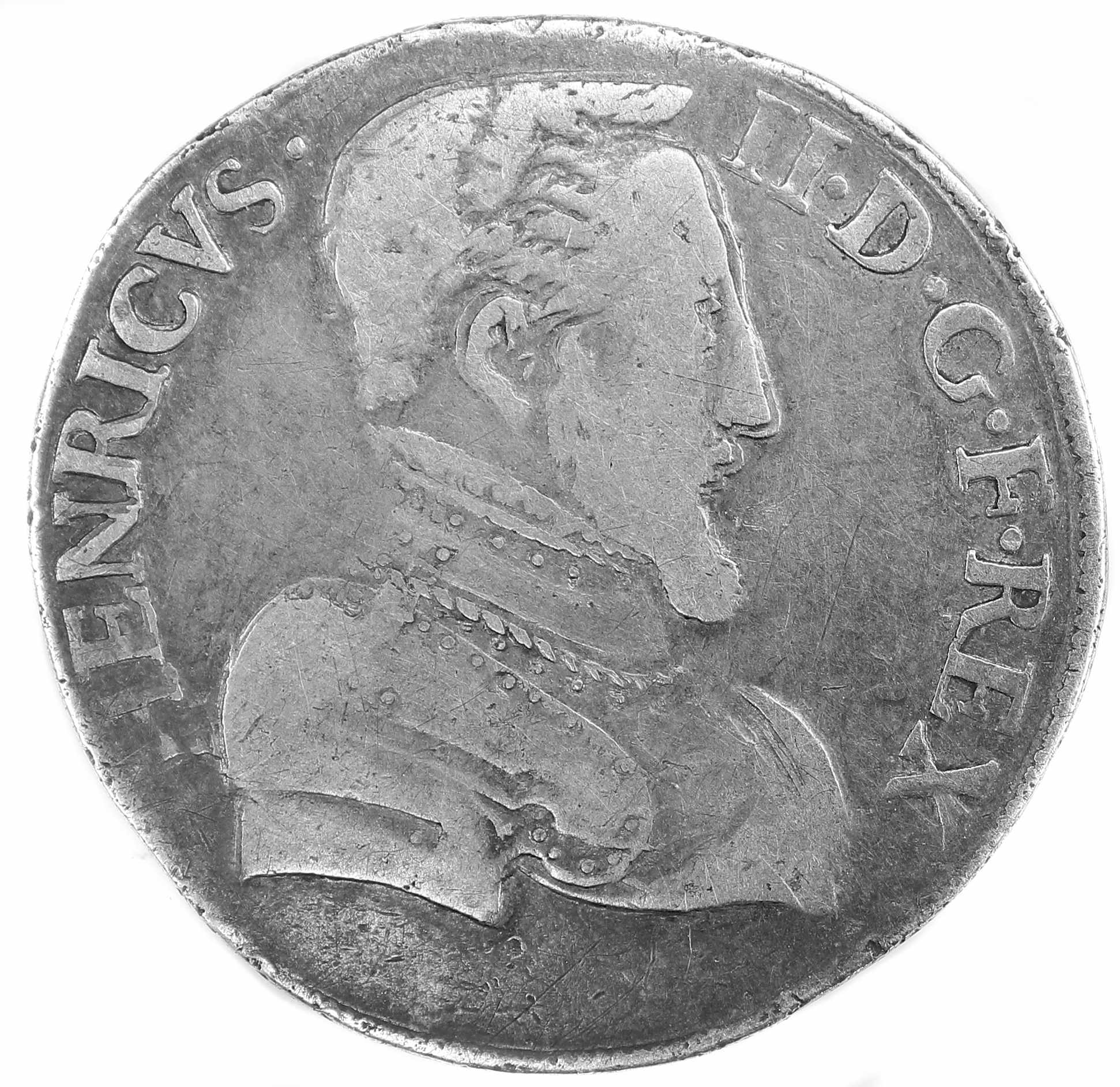 HENRICVS.II..D.G.F.REX Henri II par la grâce de Dieu roi des Francs Buste du roi, tête nue, cuirassé à droite |