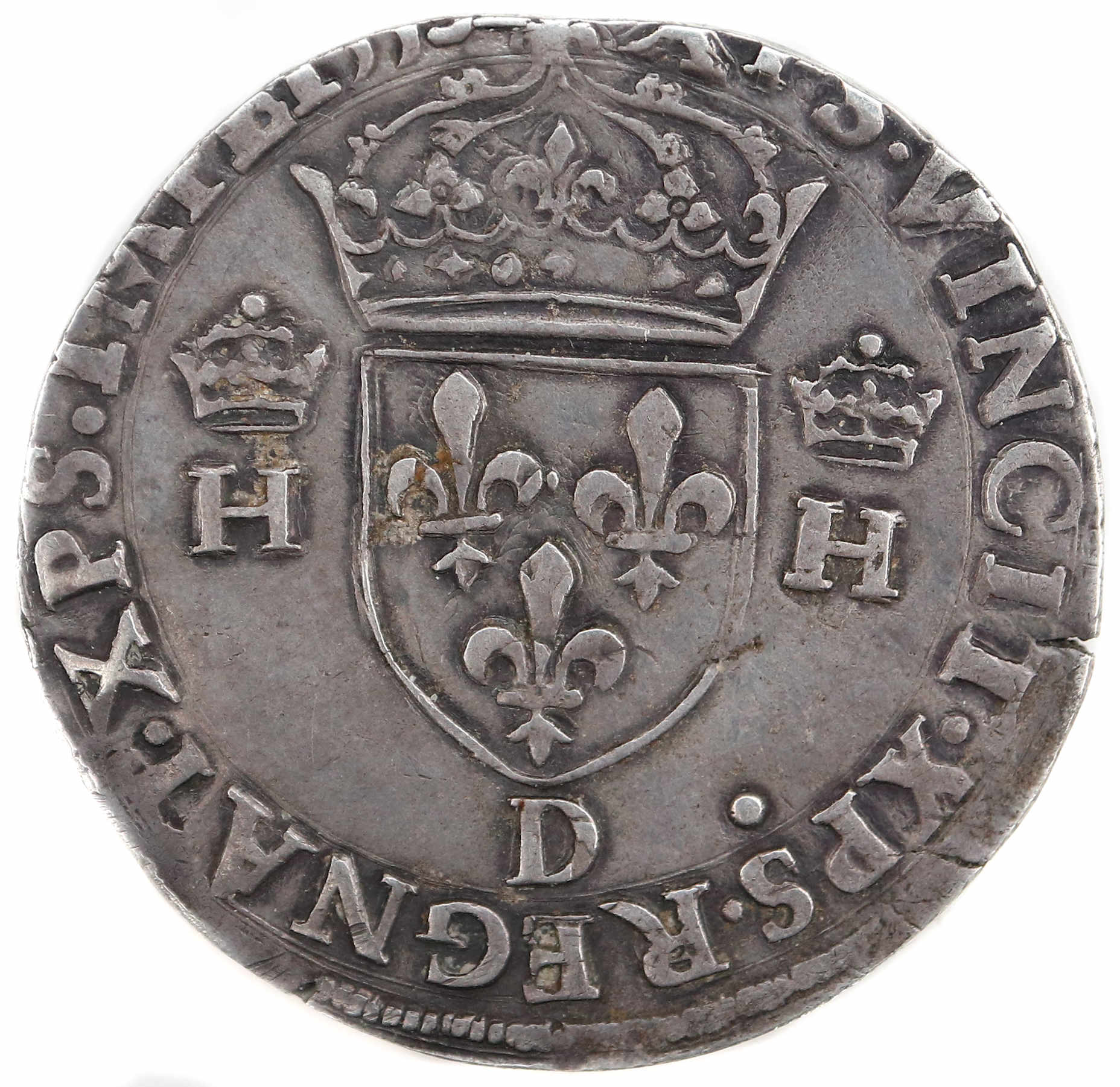 +XPS.VINCIT.XPS.REGNAT.XPS.IMPE.1553 Christ vainc, Chrisr règne. Christ commande. Ecu de France couronné accosté de 2 H couronnées. |