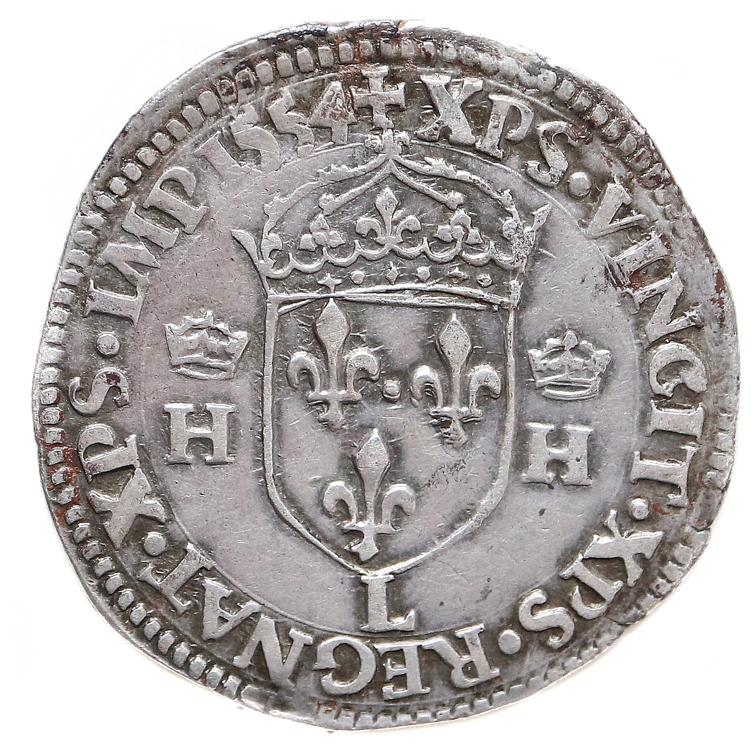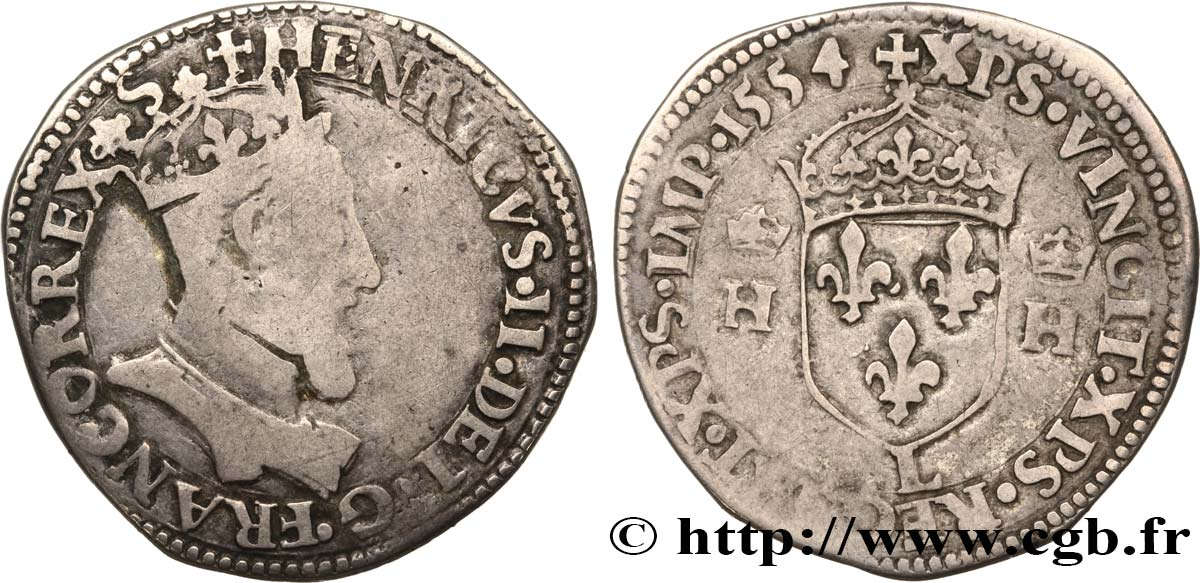 Lettre d'atelier : L (au revers sous l'écu) Point secret : Non Millésime : 1554 Chiffre de frappe connu : 65