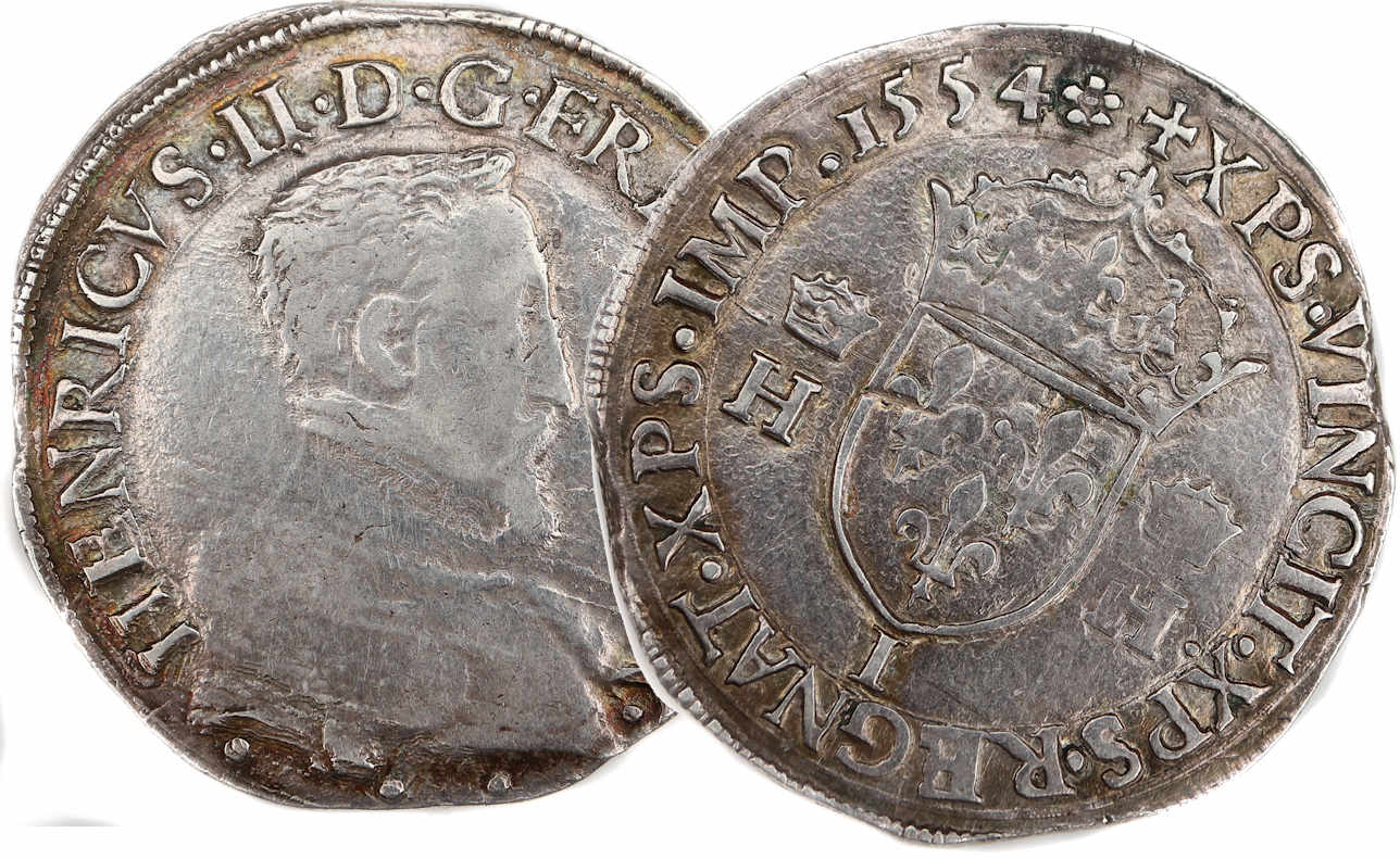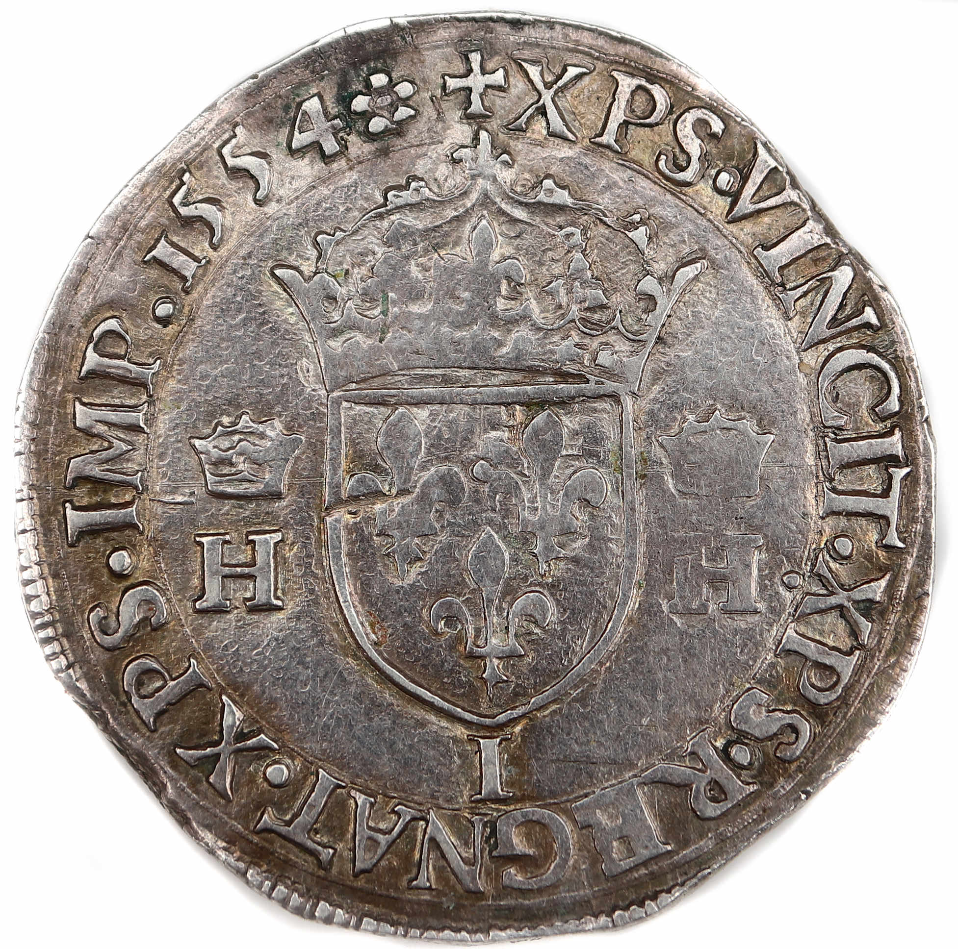Lettre d'atelier : I (au revers sous l'écu) Point secret : 10éme (au droit et au revers) Millésime : 1554 Chiffre de frappe connu : 39 474 ex (avec 1/2 testons) Indice de rareté : R3 |