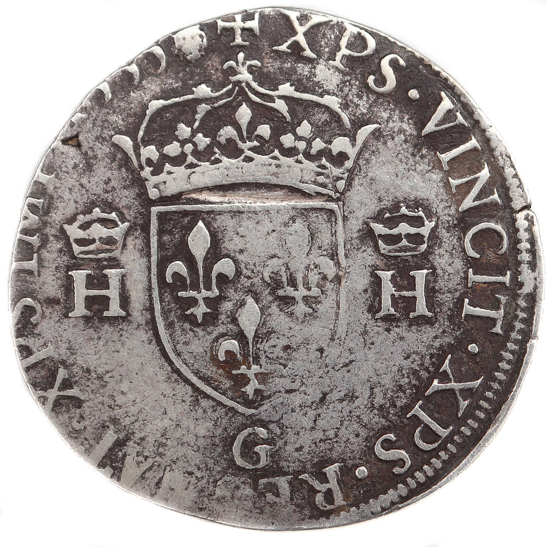 +XPS.VINCIT.XPS.REGNAT.XPS.IMP.1555(dif) Christ vainc, Chrisr règne. Christ commande. Ecu de France couronné accosté de 2 H couronnées. |