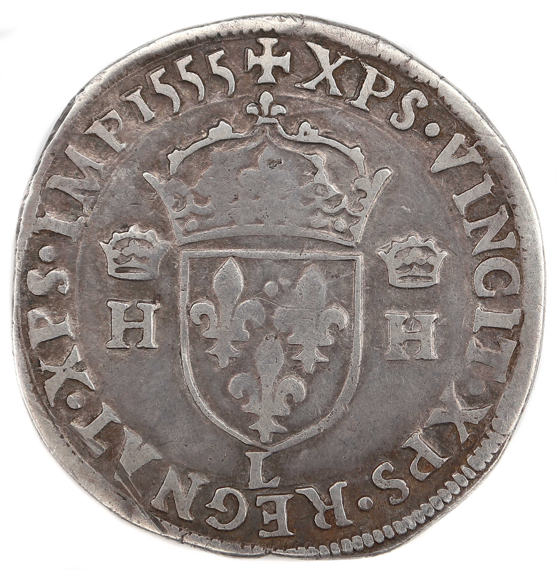 +XPS.VINCIT.XPS.REGNAT.XPS.IMP.1555 Christ vainc, Chrisr règne. Christ commande. Ecu de France couronné accosté de 2 H couronnées. |
