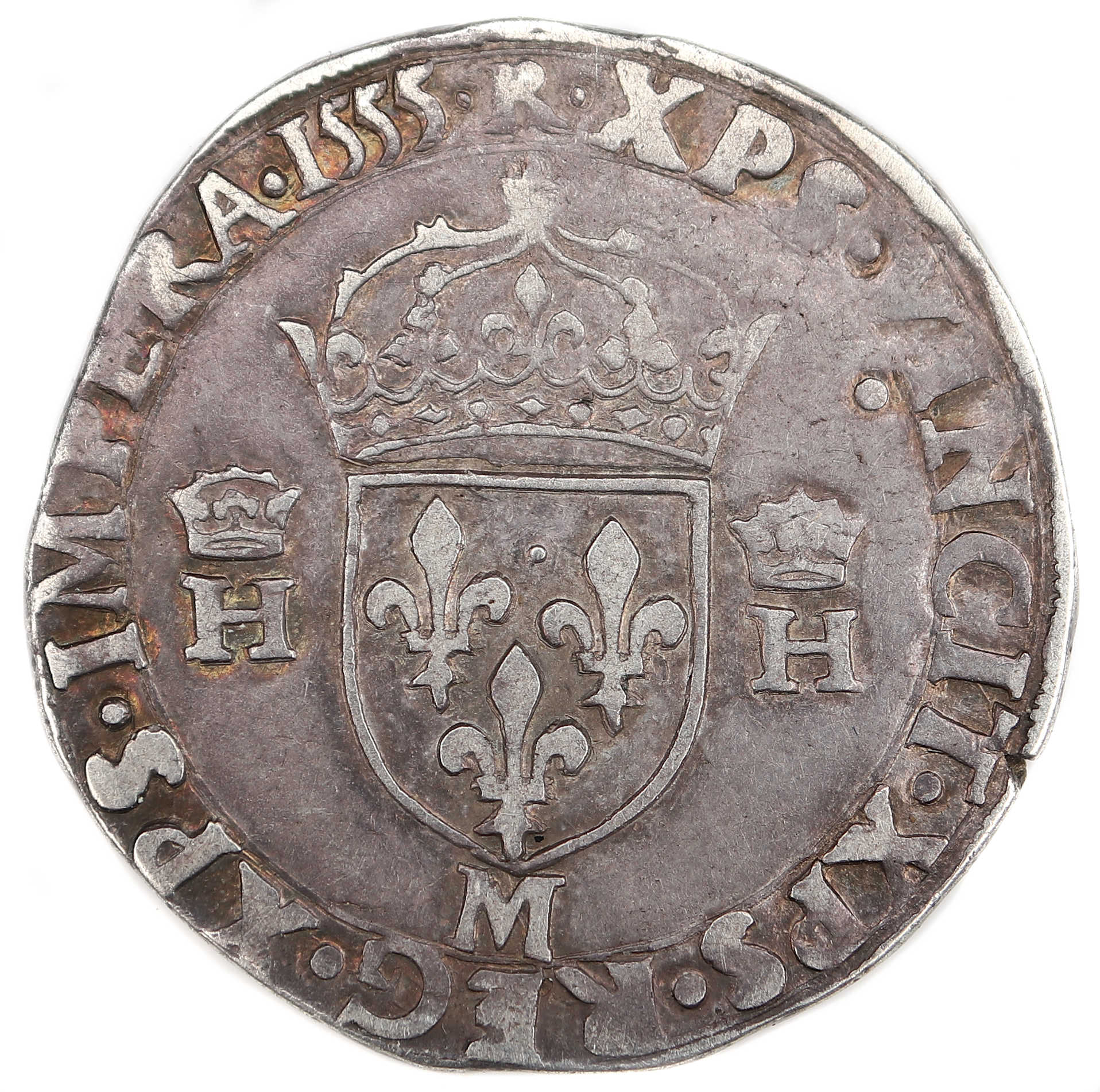 R.XPS.VINCIT.XPS.REG.XPS.IMPERA.1555. Christ vainc, Chrisr règne. Christ commande. Ecu de France couronné accosté de 2 H couronnées. |