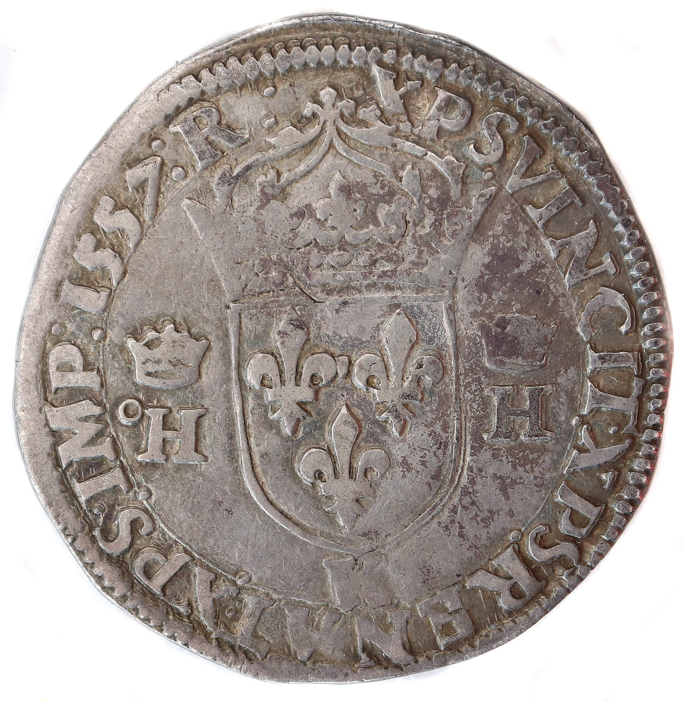 XPS:VINCIT:XPS.:RENAT:.XPS:IMP:1557:R: Christ vainc, Chrisr règne. Christ commande. Ecu de France couronné accosté de 2 H couronnées. |