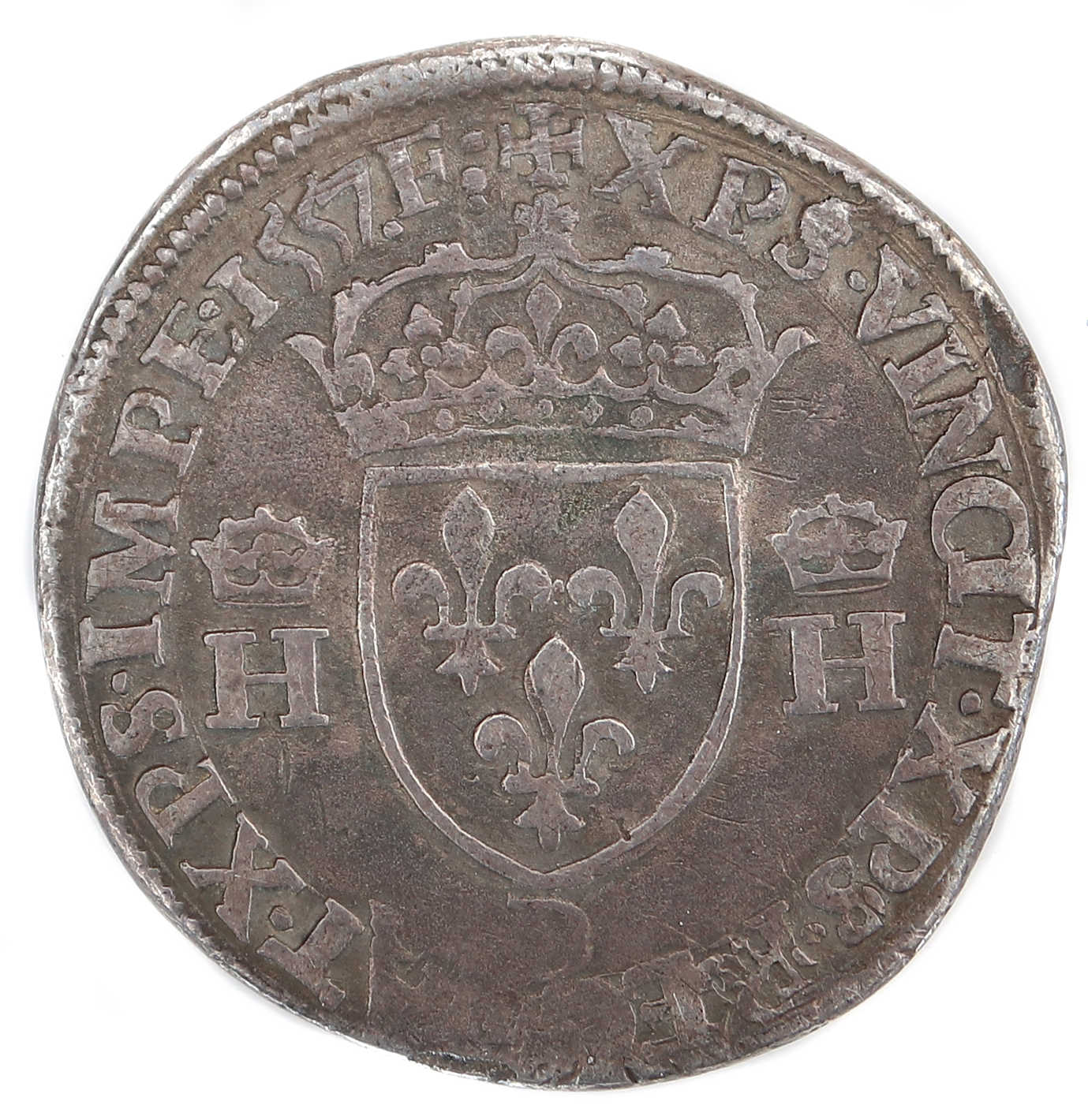 +XPS.VINCIT.XPS.REGNAT.XPS.IMPE.1557.F. Christ vainc, Chrisr règne. Christ commande. Ecu de France couronné accosté de 2 H couronnées. |