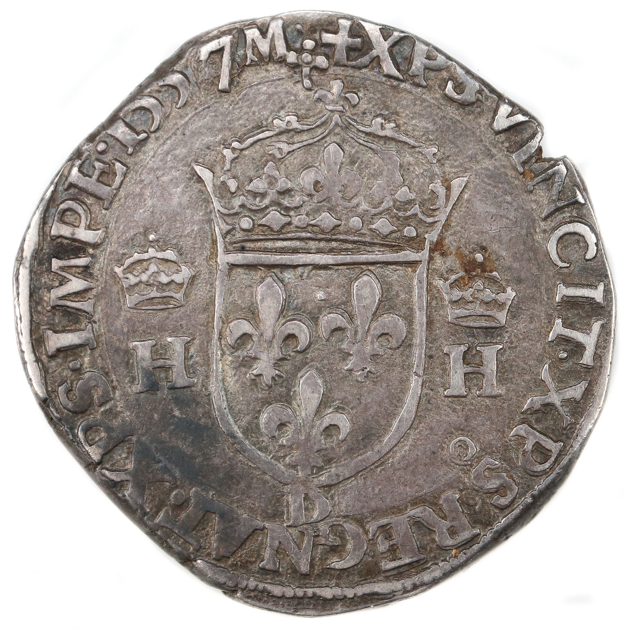 +XPS.VINCIT.XPS.REGNAT.XPS.IMPE.1557 (dif)(dif) Christ vainc, Chrisr règne. Christ commande. Ecu de France couronné accosté de 2 H couronnées. |